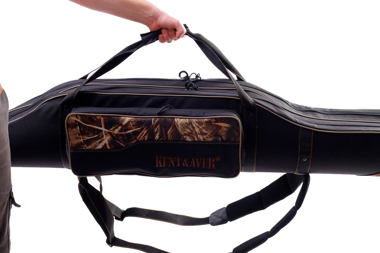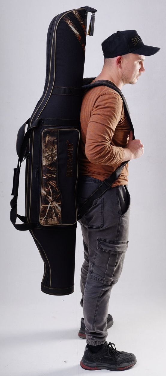 - Особенности: 2 наплечных ремня, водонепроницаемый, двухзамковая застежка-молния, карман для хранения стоек, открывается с двух сторон, перевозка удилищ без снятия с них катушек, ручка-лямка в верхней части