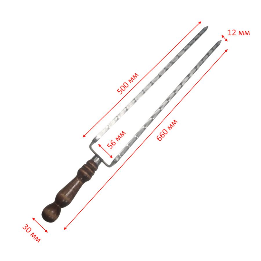 Двойной шампур (шампур-вилка) изготовлен из высококачественной нержавеющей стали 3 мм и шириной 12 мм. Шампур снабжен деревянной ручкой. Ручка окрашена и лакирована.