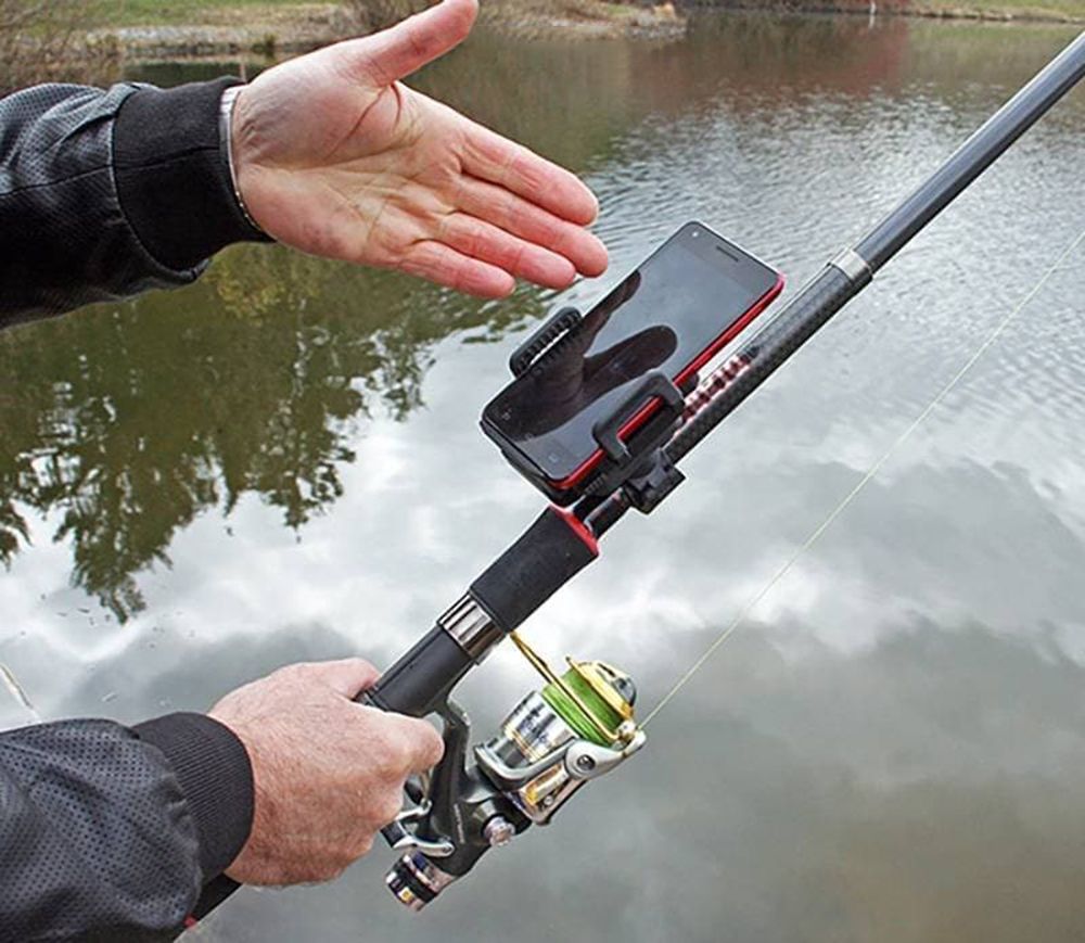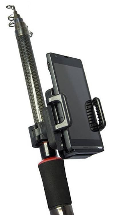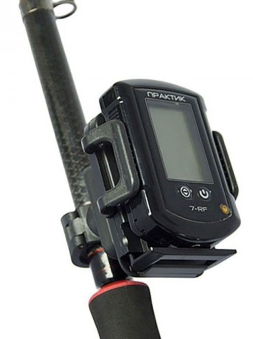 Воспользовавшись фирменным фиксатором на удочку, Вы сможете закрепить на удилище смартфон или блок «Практик 7RF» при забросе в водоем беспроводного датчика.