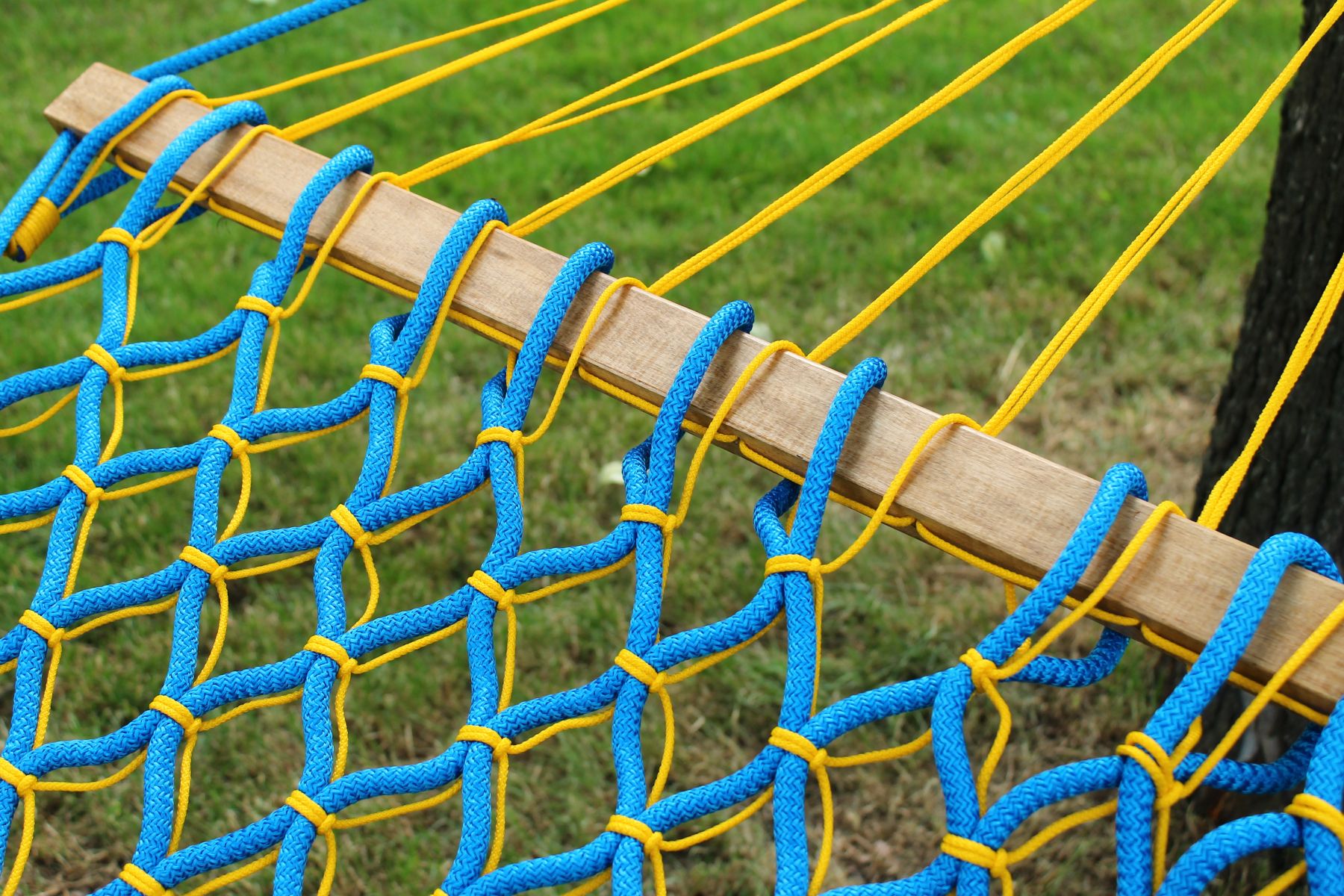 Супер усиленный безузловой гамак на деревянной перекладине - надёжный и удобный, способный выдержать большой вес солидного человека. Безузловой гамак усиленный - комфортный за счёт отсутствия узловых элементов выступающих над поверхностью.