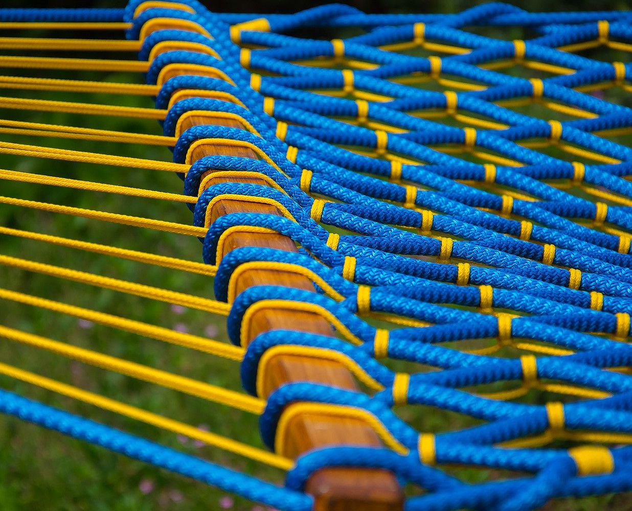 Супер усиленный безузловой гамак на деревянной перекладине - надёжный и удобный, способный выдержать большой вес солидного человека. Безузловой гамак усиленный - комфортный за счёт отсутствия узловых элементов выступающих над поверхностью.