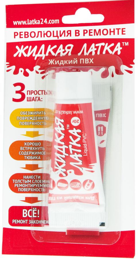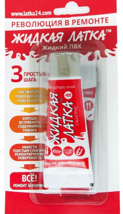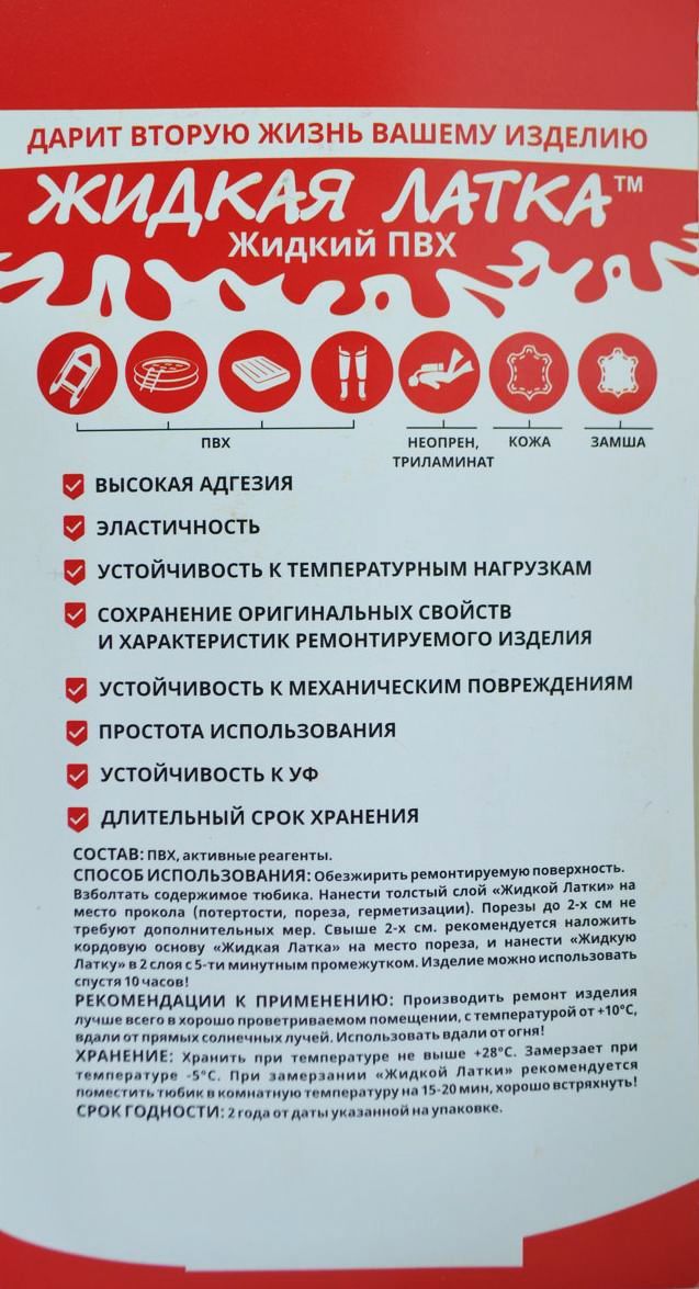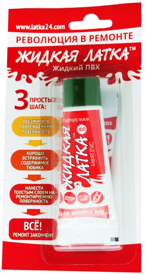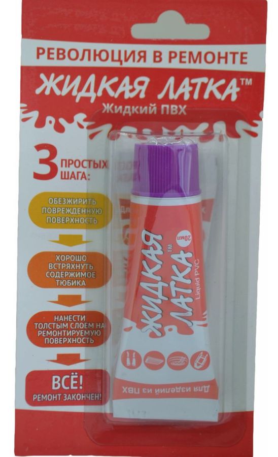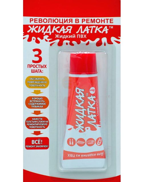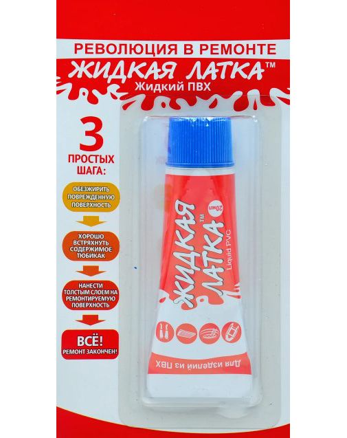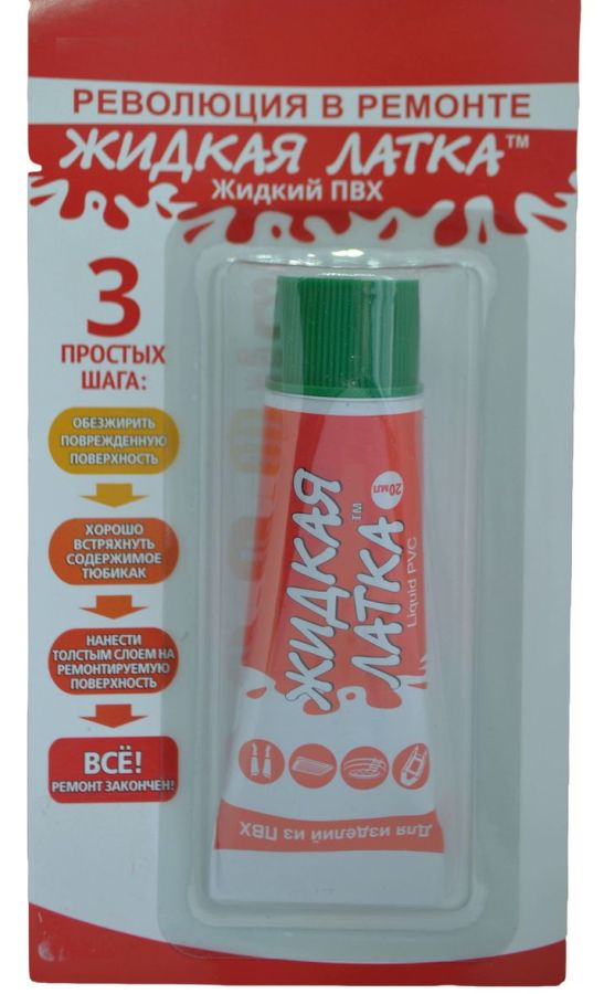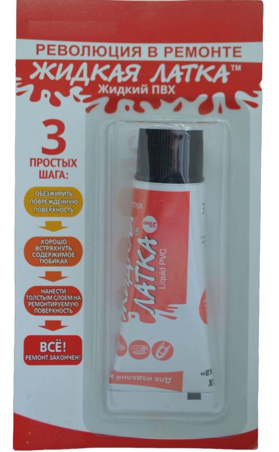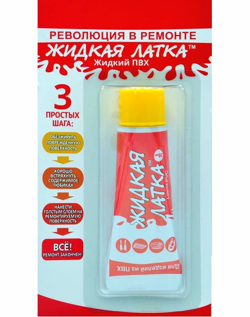 Жидкая латка для ремонта любых изделий из ПВХ. Теперь Вам не придется искать латку из похожего материала, чтобы заклеить поврежденные матрас или лодку. Достаточно нанести несколько капель на прокол или порез.