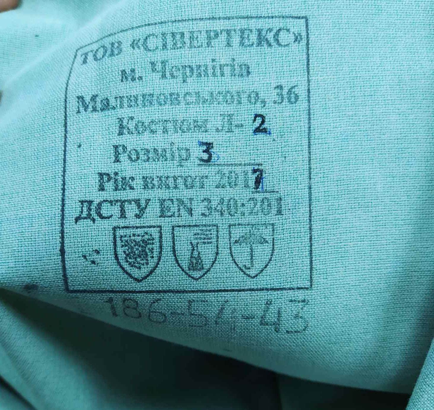 Костюм Л-2 из БЦК имеет маркировку, нанесенную на куртку и брюки с изнаночной стороны о размере и модели.