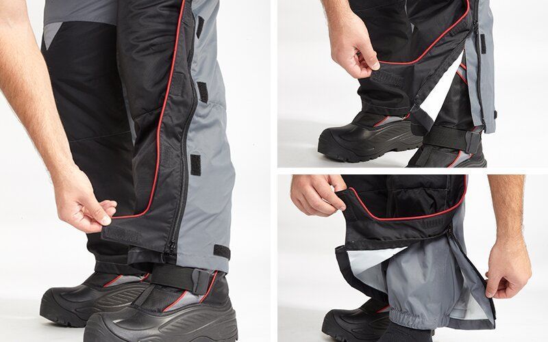 Снизу брюк снегозащитная внутренняя манжета из тонкой ткани с регулируемым запахом. Сверху она прикрыта штаниной с регулировкой объема на липучке и двух замковой молнией, что дает возможность оптимальной подгонки штанины по обуви и дополнительной вентиляции.