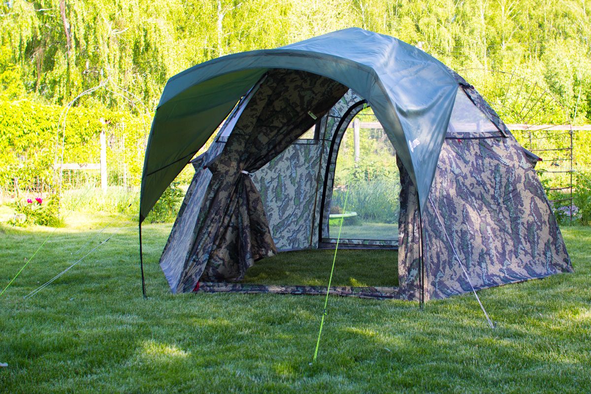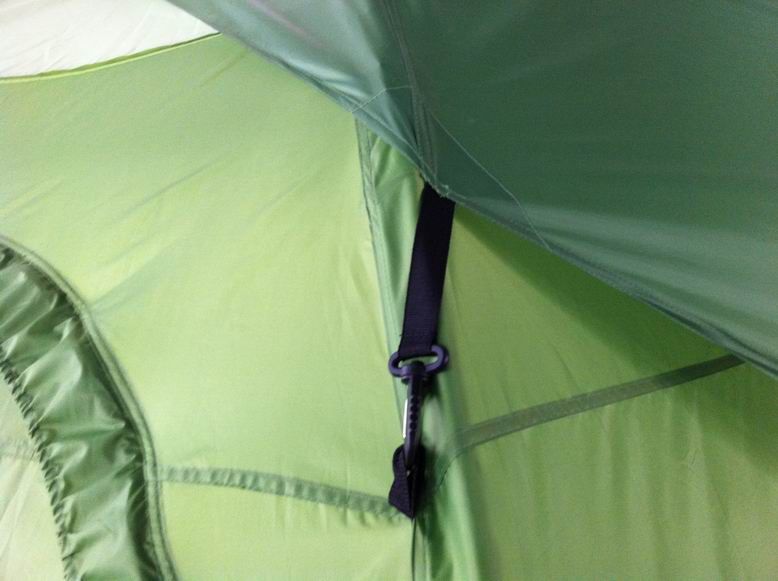 - Накиньте тент козырька на палатку так, чтобы арка козырька располагалась перед входом в палатку. Закрепите его специальными карабинами к петлям растяжек на палатке (рис 2).