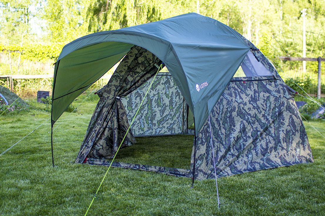 Палатка ЛОТОС 5 в комплекте с козырьком очень удобна для любителей рыбной ловли на берегу водоема.