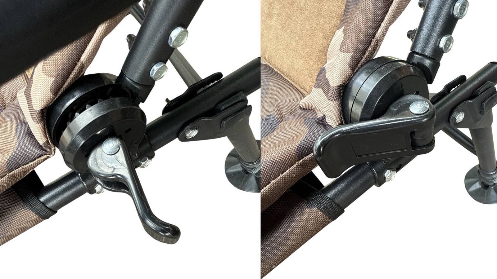 Многоуровневая система раскладывания позволяет легко менять положение спинки с помощью зубчатых фиксаторов - раскладывается в положение "лёжа" с помощью надёжных фиксаторов-зажимов на зубчатых шарнирах, что позволяет откинуть спинку и зафиксировать её в нужном комфортном положении. Благодаря такой регулировке кресло можно превратить в стул для кемпинга, или откинув спинку, использовать как шезлонг для отдыха и загара.