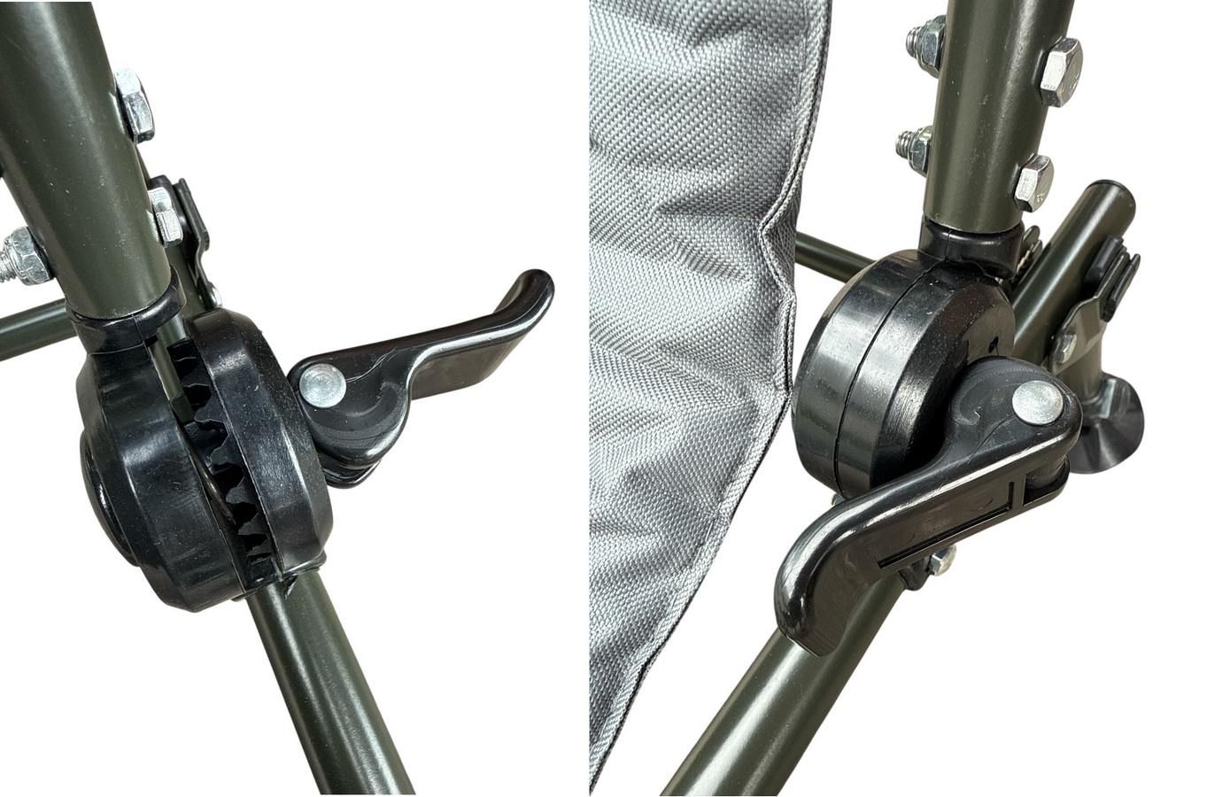 Многоуровневая система раскладывания позволяет легко менять положение спинки с помощью зубчатых фиксаторов - раскладывается в положение "лёжа" с помощью надёжных фиксаторов-зажимов на зубчатых шарнирах, что позволяет откинуть спинку и зафиксировать её в нужном комфортном положении. Благодаря такой регулировке кресло можно превратить в стул для кемпинга, или откинув спинку, использовать как шезлонг для отдыха и загара.