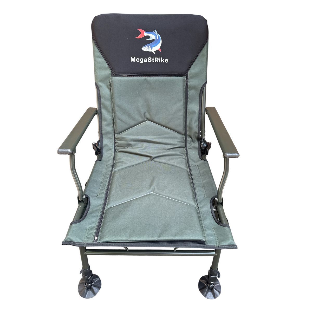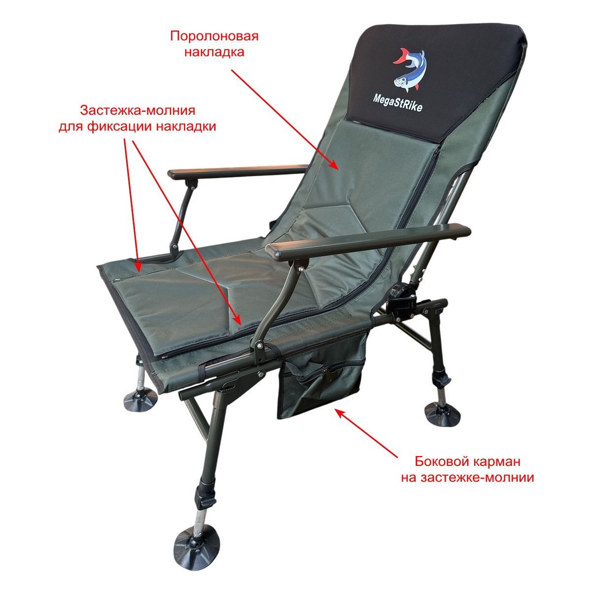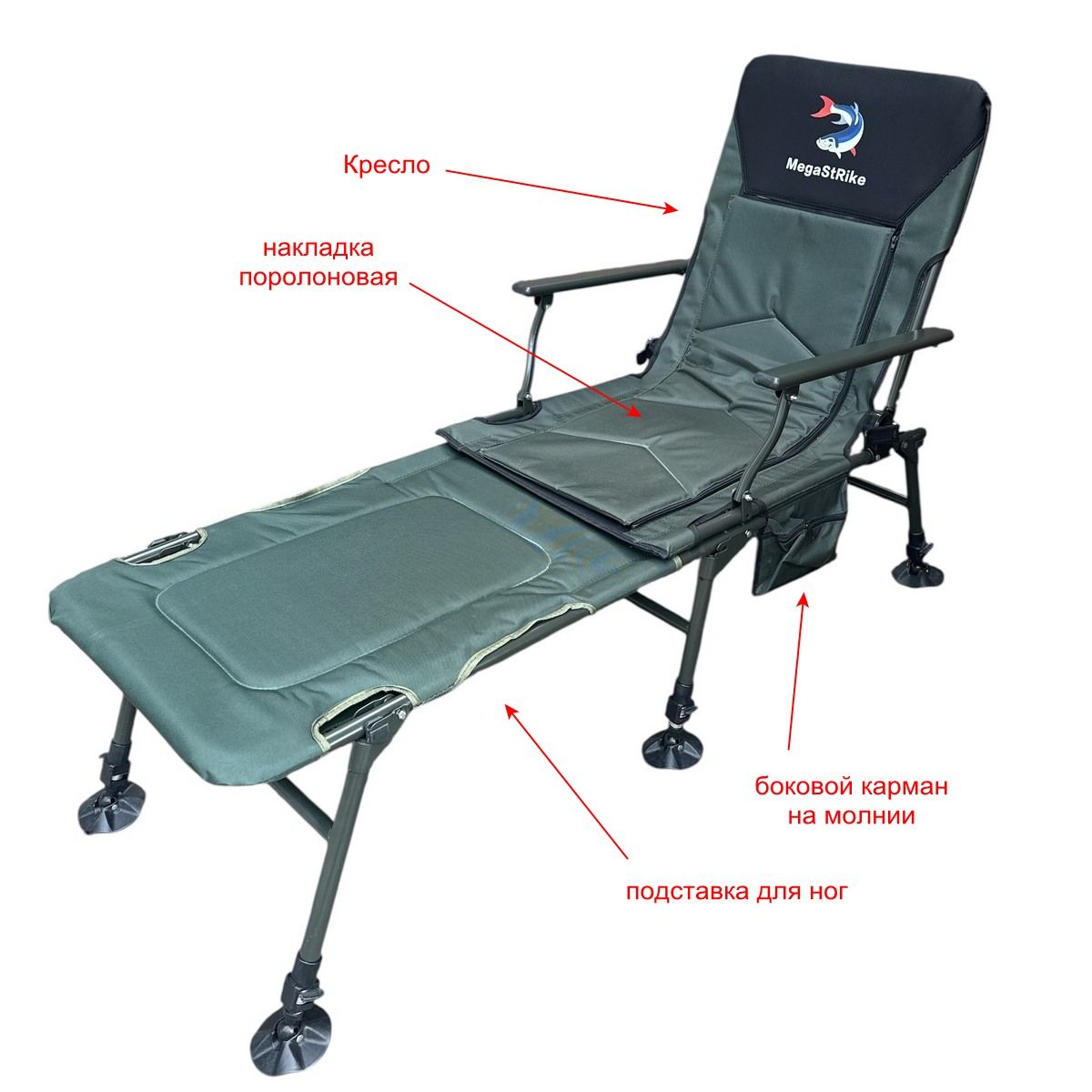 Карповое кресло Megastrike с подставкой для ног - SH9-3-8 - (70+50)x55x95 см - С боковым карманом на змейке - Олива