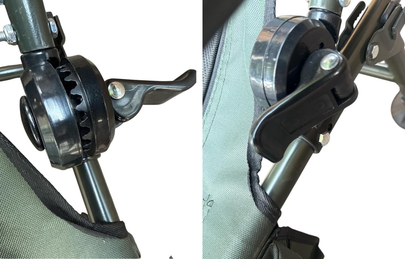 Многоуровневая система раскладывания позволяет легко менять положение спинки с помощью зубчатых фиксаторов - раскладывается в положение "лёжа" с помощью надёжных фиксаторов-зажимов на зубчатых шарнирах, что позволяет откинуть спинку и зафиксировать её в нужном комфортном положении. Благодаря такой регулировке кресло можно превратить в стул для кемпинга, или откинув спинку, использовать как шезлонг для отдыха и загара.