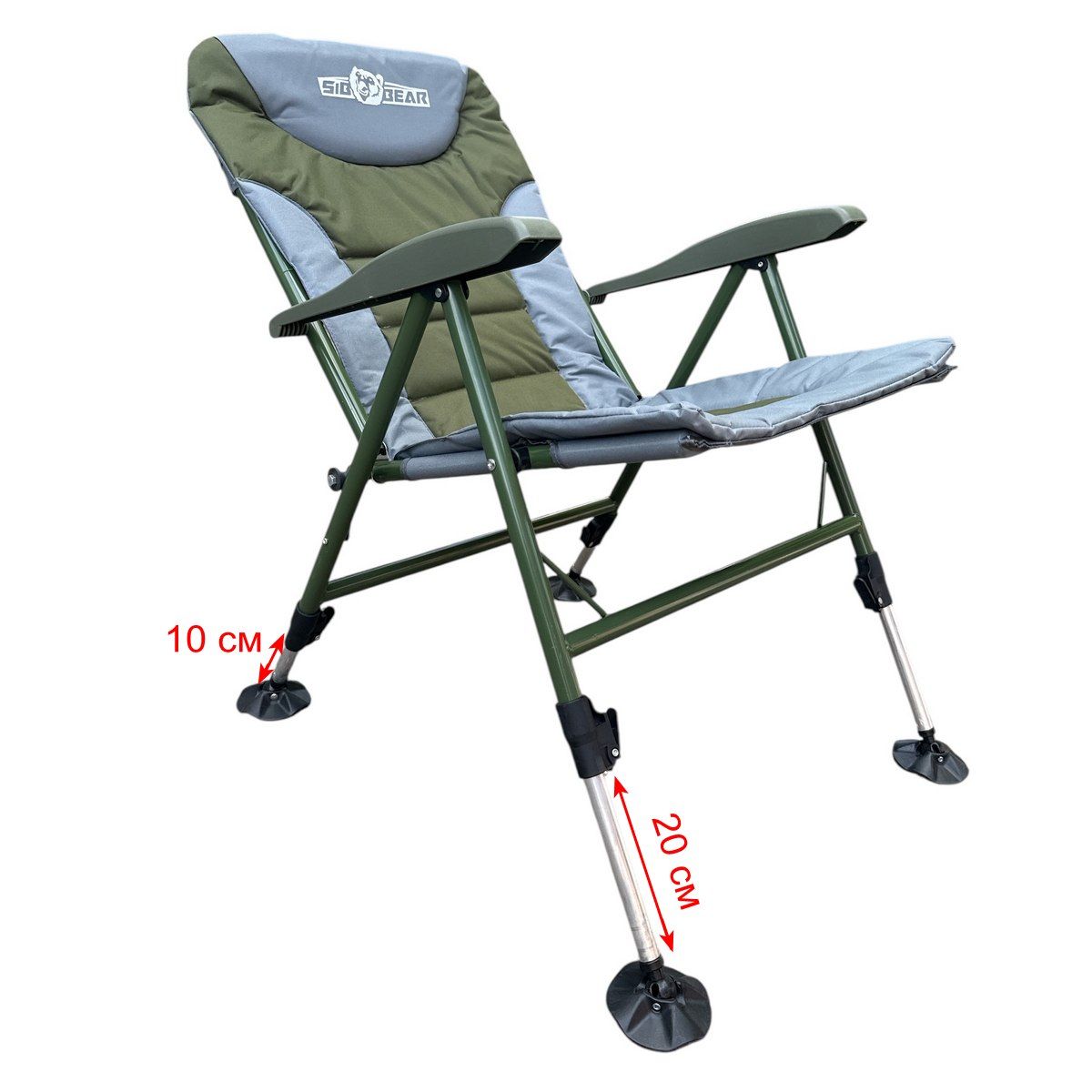 Ножки кресла на подвижных шарнирах имеют телескопическую конструкцию. Передние ножки выдвигаются на 20 см, задние - на 10 см, что не только позволяет располагать кресло на неровной поверхности, но и подбирать нужную для отдыхающего высоту сидения. Ножки оканчиваются мощными накладками-шарнирами (пятками) с ребрами жесткости, которые не дают креслу проваливаться в мягкий грунт.