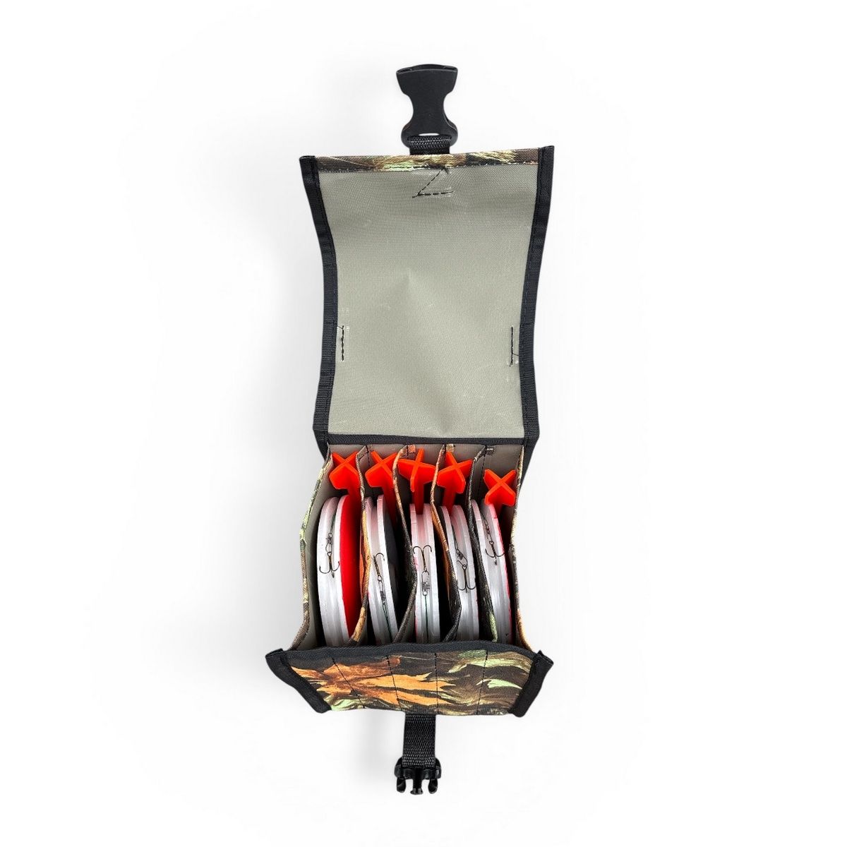 - Сумка имеет 1 большой отдел разделенный на 5 вертикальных секций для кружков рыболовных.
