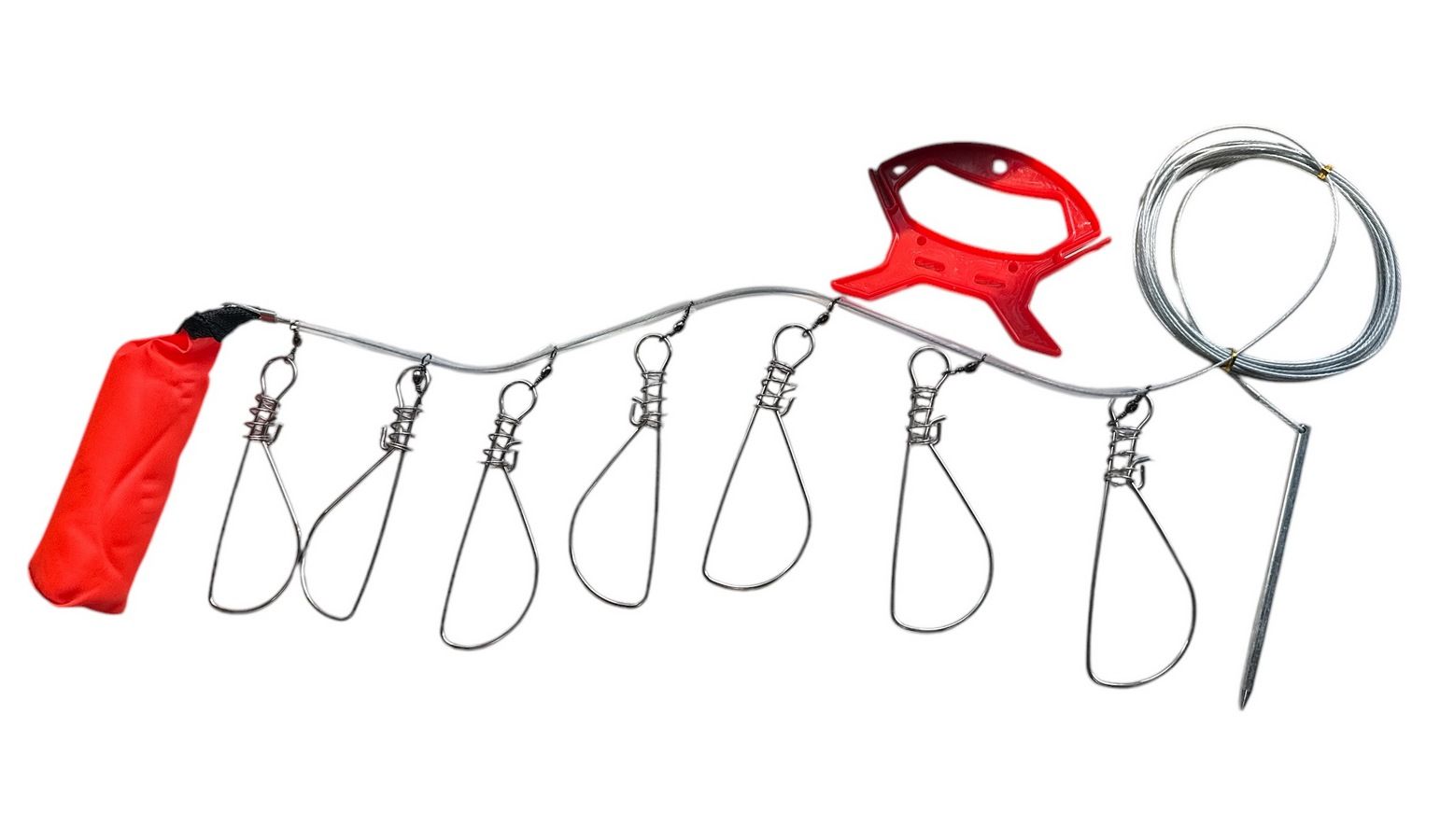 Кукан имеет металлический колышек для надежной фиксации и рукоять для намотки троса. На противоположном его конце есть поплавок, который не даст притопить кукан пойманной рыбе и зацепиться за водоросли. Карабины большой формы и подойдут для рыбы любого вида.