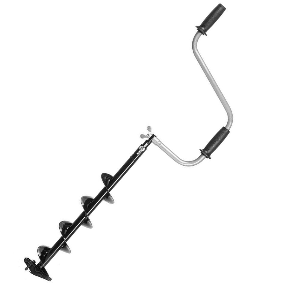Запатентованный замок ласточкин хвост надежно фиксирует ручку в разложенном состоянии не давая люфта. Ручки выполнены из мягкого пластика, который остается приятным на ощупь даже в сильные морозы. Верхняя рукоятка ледобура смещена относительно оси ледобура на 105 мм, а нижняя на 165 мм. Такое расположение рукояток позволяет вращать ледобур одновременно двумя руками, тем самым увеличивая скорость бурения лунок во льду. Несмотря на малый размер глубина бурения доходит до метра. Надежное полимерное покрытие, стойкое к резким перепадам температур, делает внешний вид ледобура очень красивым.