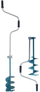 Основное и единственное отличие двуручных ледобуров от классических – верхняя рукоятка ледобура смещена относительно оси ледобура на 130 мм, а нижняя на 150 мм. Такое расположение рукояток позволяет вращать ледобур одновременно двумя руками, тем самым, увеличивая скорость бурения лунок во льду. Кроме того, существенно уменьшаются габариты ледобура в транспортном положении. По всем остальным характеристикам двуручные ледобуры полностью соответствуют классическим.