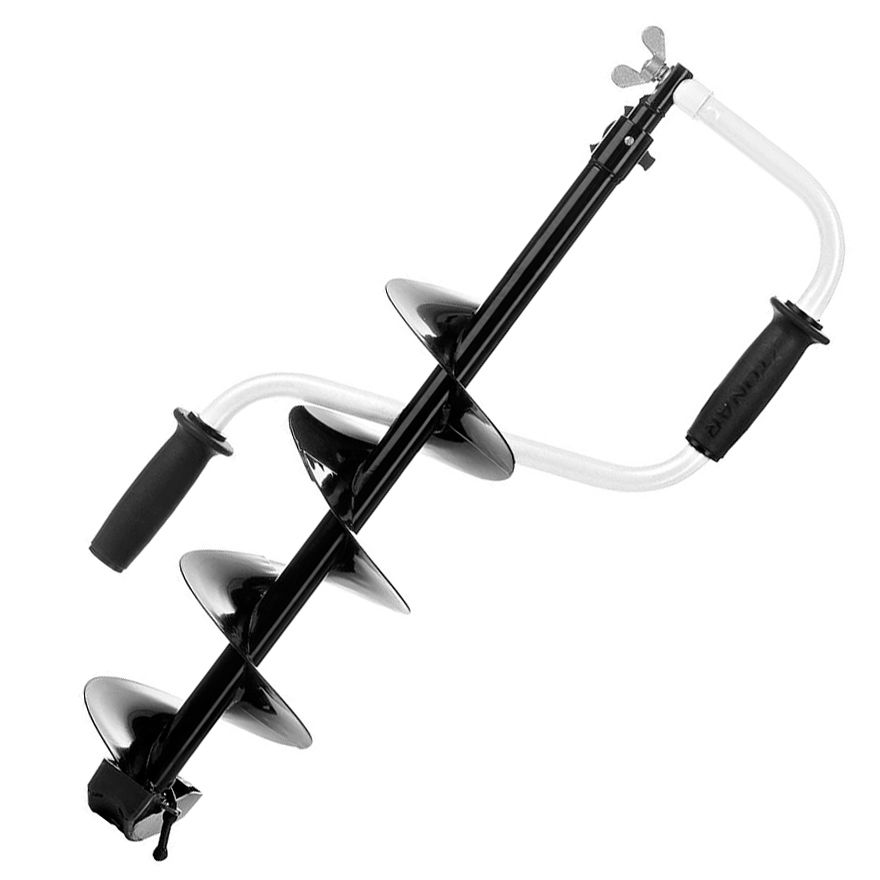 Верхняя рукоятка ледобура смещена относительно оси ледобура на 101 мм, а нижняя на 169 мм. Такое расположение рукояток позволяет вращать ледобур одновременно двумя руками, тем самым увеличивая скорость бурения лунок во льду. Несмотря на малый размер глубина бурения доходит до метра. Надежное полимерное покрытие, стойкое к резким перепадам температур, делает внешний вид ледобура очень красивым.