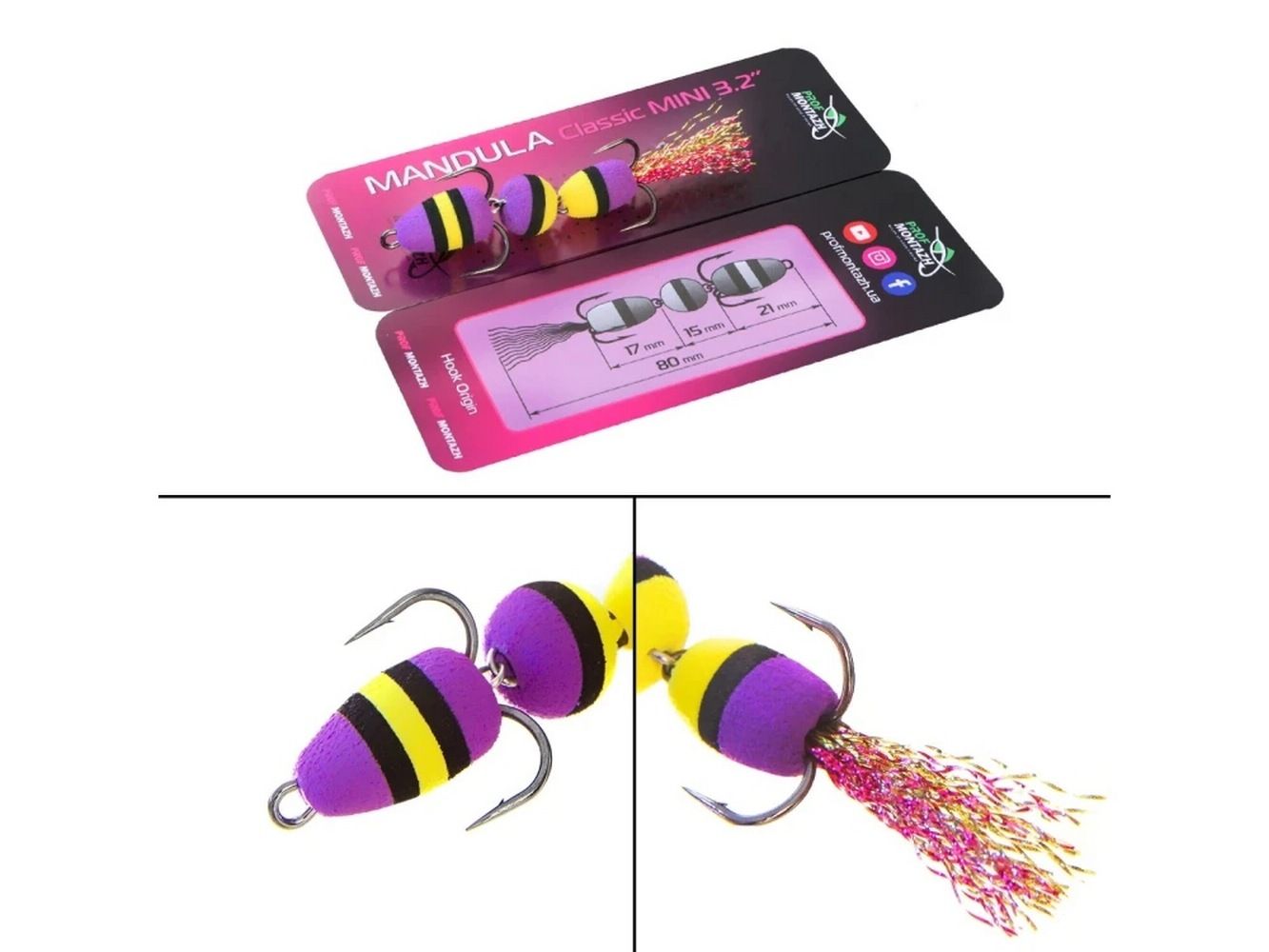 Mandula Classic Mini 3,2" (80 мм) - изготовлена из 3 сегментов шаровидной формы. Каждый сегмент между собой скрепляется крепкой нержавеющей проволокой диаметра 0,8мм. Вся серия Classic отличается надежностью и мощью. Оснащается двумя острыми тройниками номер 2 и 4. Опушка на хвосте из качественного люрекса, который на этапе изготовления мандулы дополнительно рыхлится вручную.