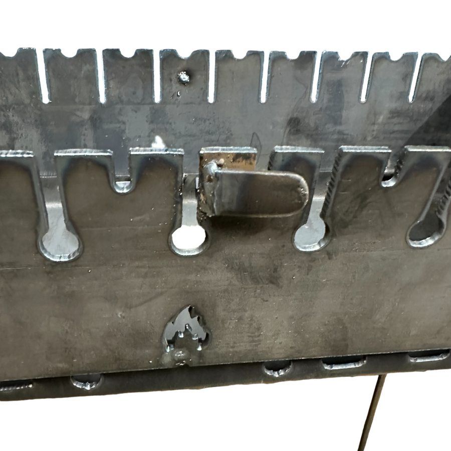 Дно мангала Огонёк изготовлено из цельного листа метала толщиной 3 мм, а не сварено из нескольких элементов. Это уменьшило количество сварных швов и повысило прочность и долговечность мангала. Ножки мангала изготовлены из стального прутка диаметром 10 мм и выполнены съёмными - вкручиваются в дно.