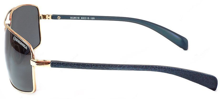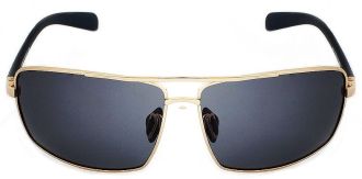 Тонкая оправа изготовлена из прочного металлического сплава, цвет оправы - золото. На пластиковые дужки нанесена гравировка, стилизованная под кожу крокодила. Очки оснащены регулируемыми носовыми подушечками. Линзы выполнены из серого поликарбоната. В комплект входит жесткий чехол, шнурок, салфетка.
