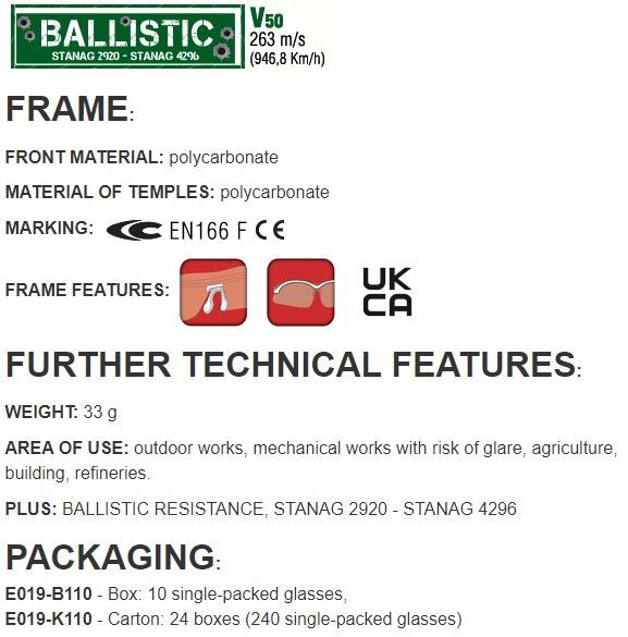 STANAG 2920 и STANAG 4296 являются стандартами оценки баллистической стойкости во всех странах-членах НАТО. В отличие от соответствия европейскому стандарту EN 166, который определяет ударопрочность стального шарика диаметром 6 мм и массой 0,86 г, попадающего в окуляры со скоростью 45 м/с, соответствие стандарту STANAG 4296 гарантирует баллистическую стойкость, определенную стандартом STANAG 2920, определяющим баллистическую стойкость против пуль калибра 3,6 мм (0,14″) и веса 325 мг, выпущенных со скоростью 215 м/с или 774 км/ч. (с возможностью достижения еще более высоких скоростей, как сообщается в отчете об испытаниях). STANAG 2920 не определяет минимальный порог защиты так же, как EN 166, но позволяет указать скорость V50, которая представляет собой скорость, при которой пуля может пробить окуляр с вероятностью 50%. Кроме того, очки, соответствующие стандарту STANAG 4296, также должны отвечать ряду требований, таких как: