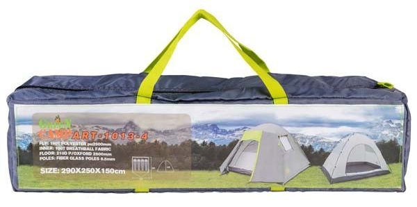 В палатку Green Camp 1013 свободно помещаются четверо взрослых людей, также при желании можно уместить 5-го человека. Палатка имеет в наличии одно спальное просторное отделение и небольшой тамбур перед входом в котором можно хранить посуду, личные вещи, спрятать обувь от дождя. Палатка проветривается при помощи циркуляции воздуха внутри помещения, что обеспечивается двумя клапанами для вентиляции. В палатке также есть два окна, которые оснащены москитной сеткой для защиты от комаров, мошкары и других мелких насекомых, окна с внешней стороны закрываются с помощью замочков. Швы палатки прошиты и проклеены.