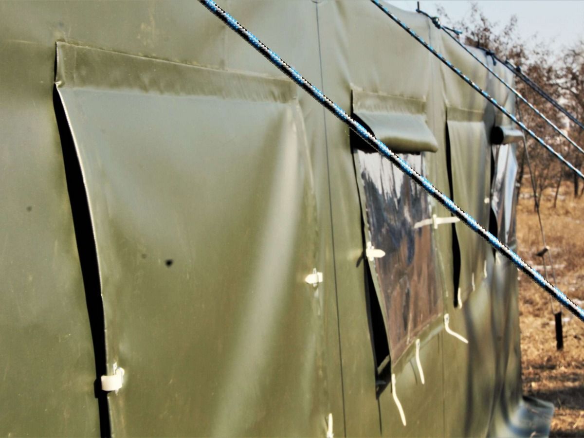 Металлические опоры окрашены специальной крепкой порошковой краской. Палатка устойчива к ветру и рассчитана на длительное использование в полевых условиях. Модернизированная версия отличается улучшенной конструкцией и материалами, что повышает комфорт и долговечность.