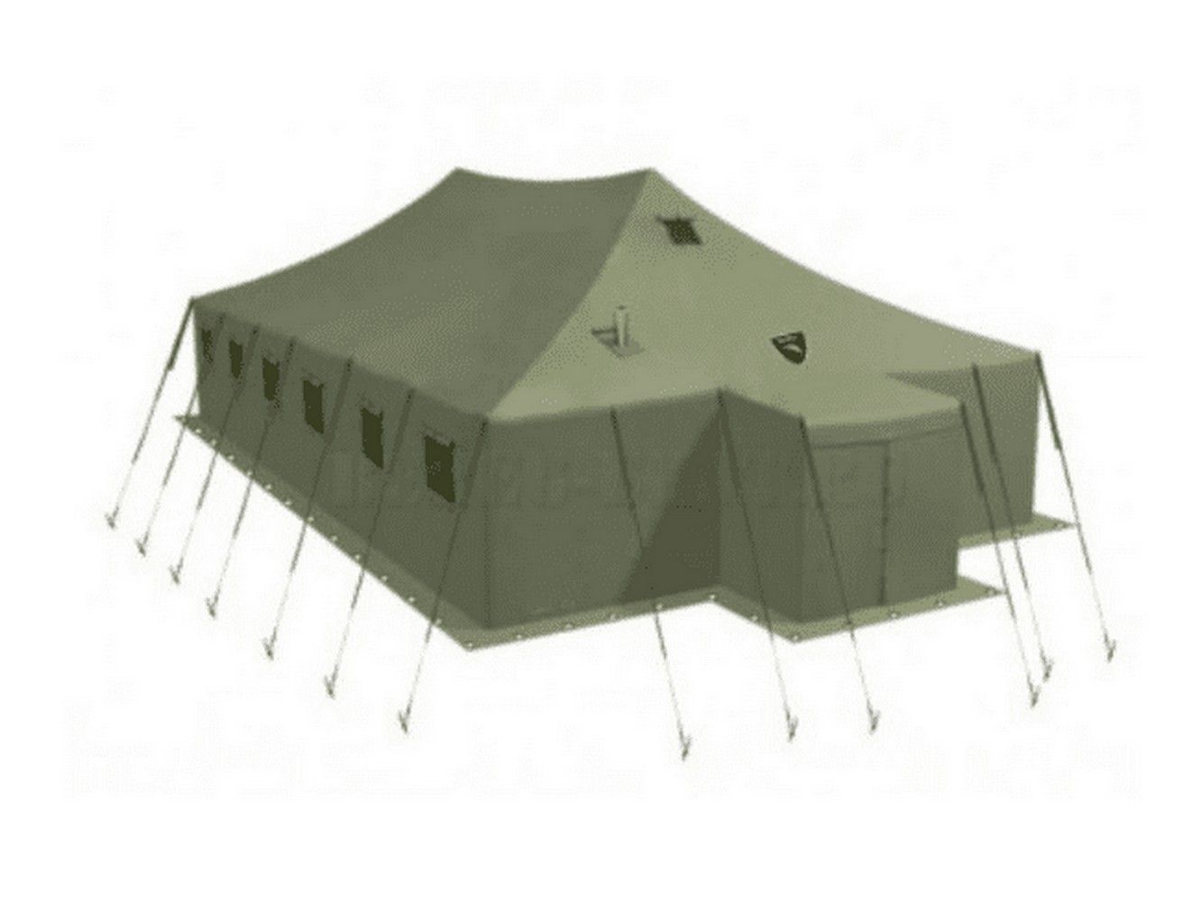 Палатка бескаркасная повышенной водостойкости. Имеет четырех скатную крышу с гребнем, вертикальные стенки, два входа с тамбурами, двенадцать окон на стенках, два дымоходных отверстия.