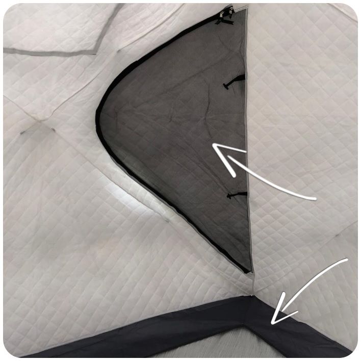 2 больших D-образных входа обеспечивают свободу передвижения, особенно когда рыбалка идет большой компанией. Открытая дверь фиксируется липучками.