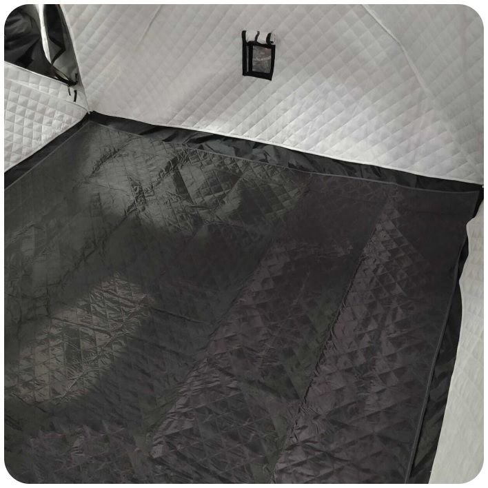 - Ткань палатки четырехслойная и утепленная. Внешний слой выполнен из ткани оксфорд, которая устойчива к износу и влаге. Внутренний слой из ткани оксфорд 210T PU с утеплителем сохраняет тепло и предотвращает конденсат. Утепленная часть при необходимости отстегивается, что делает палатку универсальной для разных сезонов.