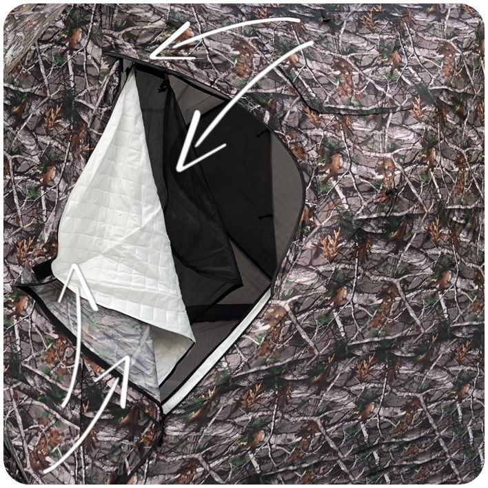 - 2 больших D-образных входа обеспечивают свободу передвижения, особенно когда рыбалка идет большой компанией. Открытая дверь фиксируется липучками.