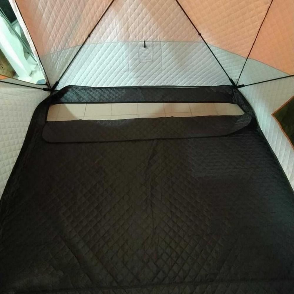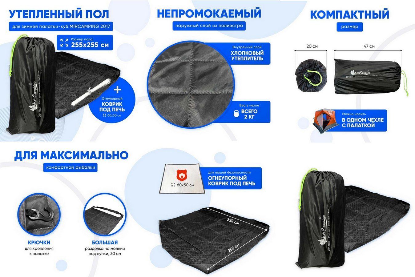 Пол для зимней палатки Mircamping 2017А обеспечивает комфортные условия для отдыха. Изготовлен из непромокаемого полиэстера с утепленной прослойкой. Пол теплый и влагостойкий со специальной утепленной прослойкой, с герметичными отверстиями под лунки, для зимнего подледного лова. Также в комплекте идет огнеупорный коврик 60х60 см под печку. Пол имеет крючки по углам для крепления к палатке. По длине палатки имеется вырез шириной 30 см на молнии для лунок.