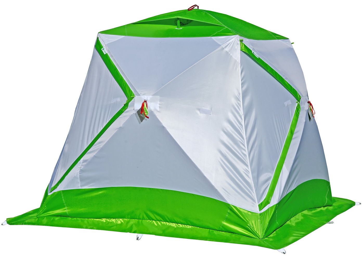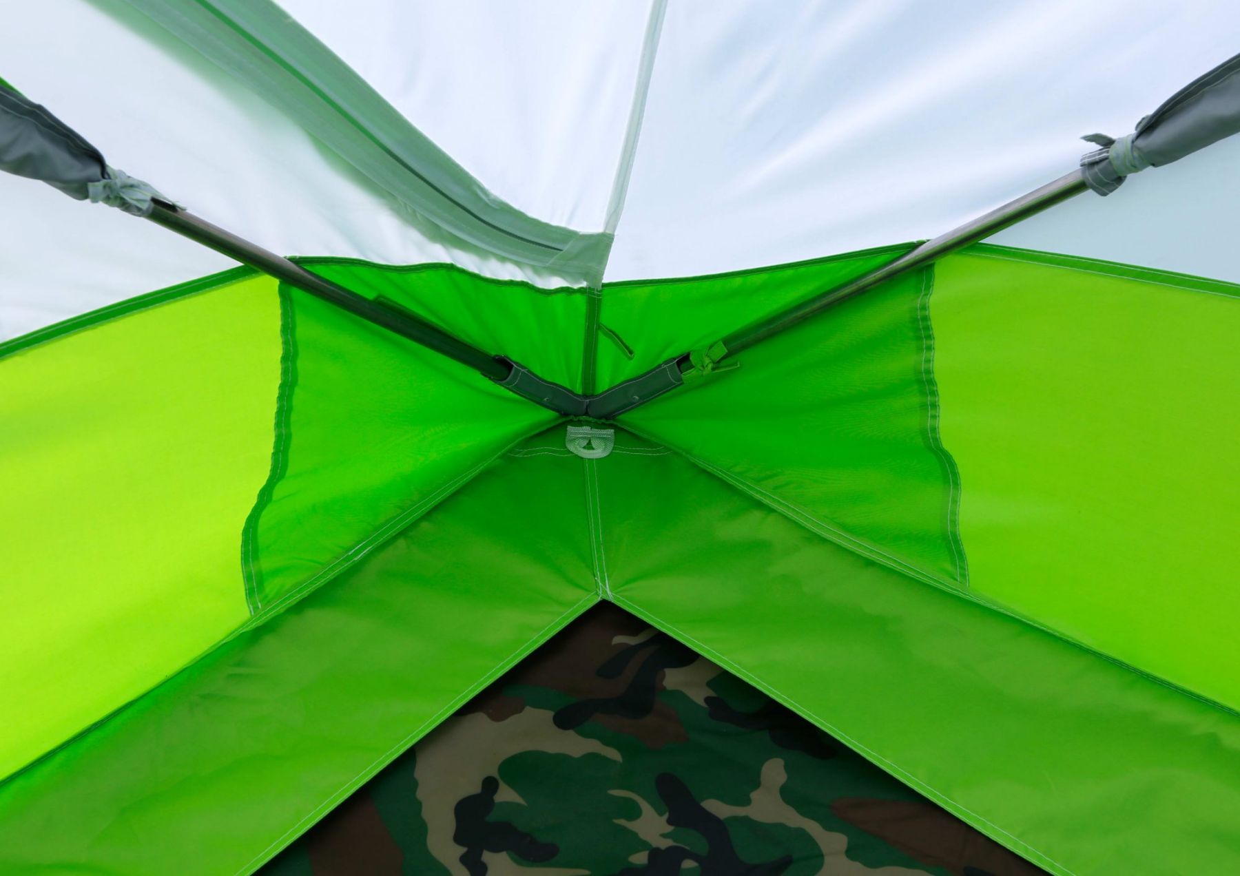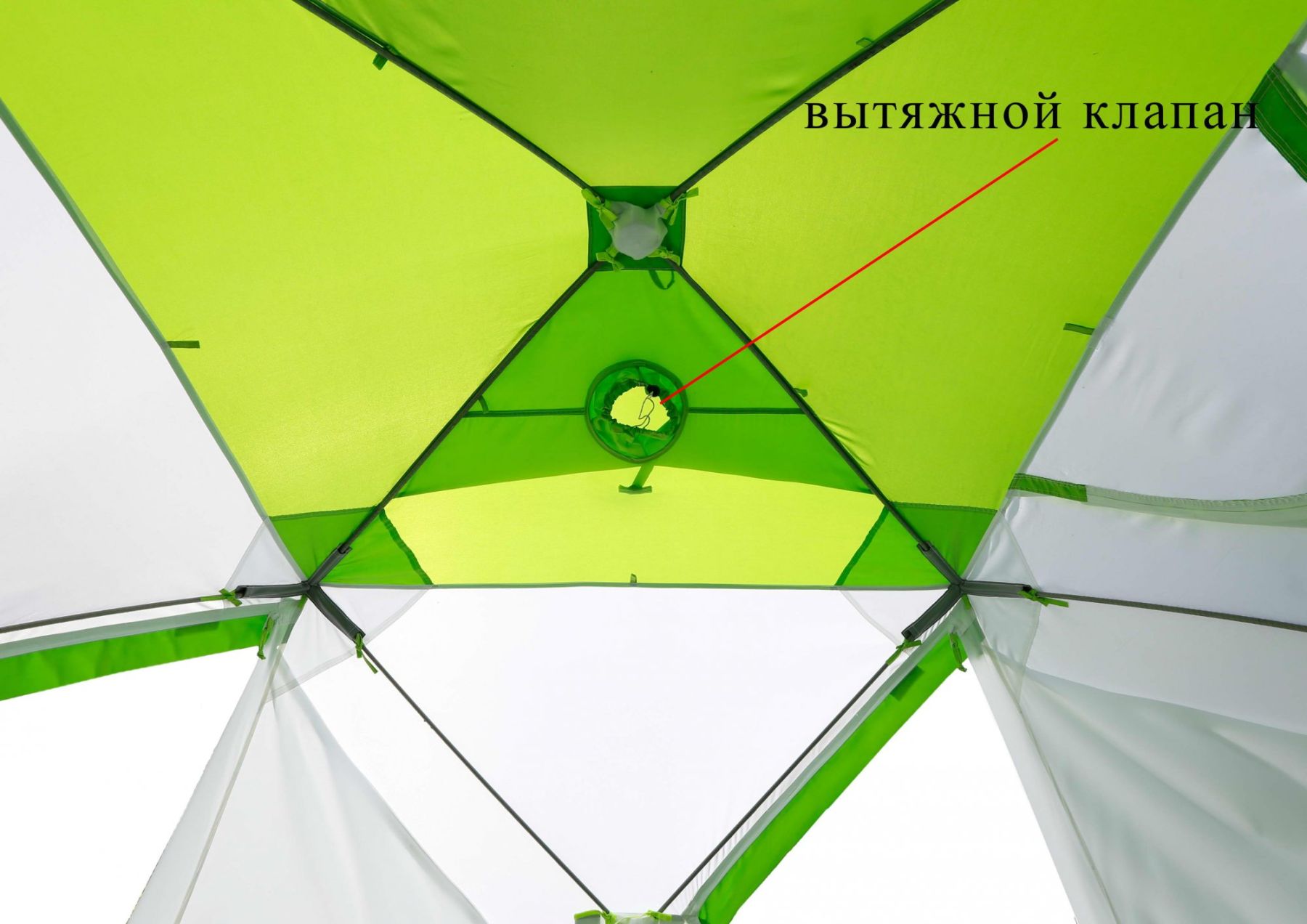 Дизайн палатки выполнен в бело-салатовом цветовом исполнении с использованием светопроводящих тканей.