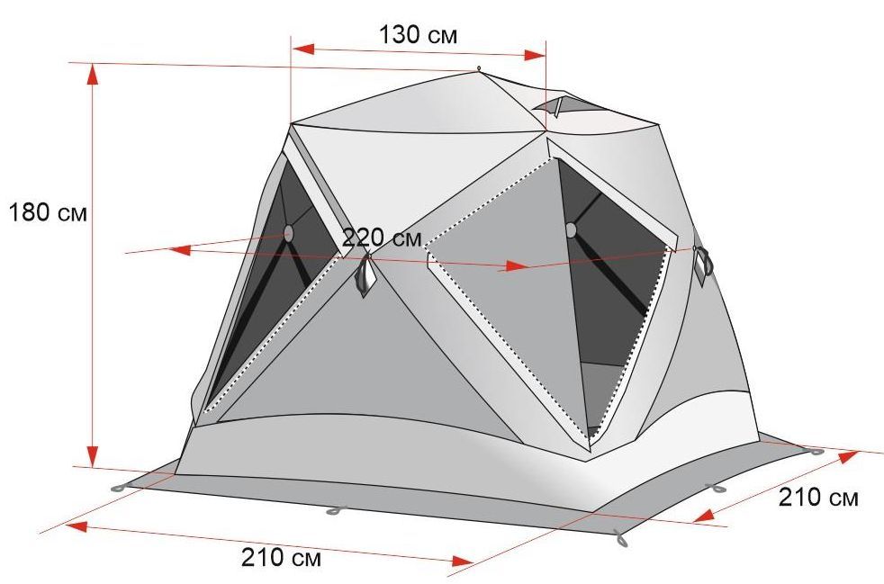 - Оптимальное соотношение пропорций конструкции. Высота палатки 180 см при ширине дна 210 х 210 см;