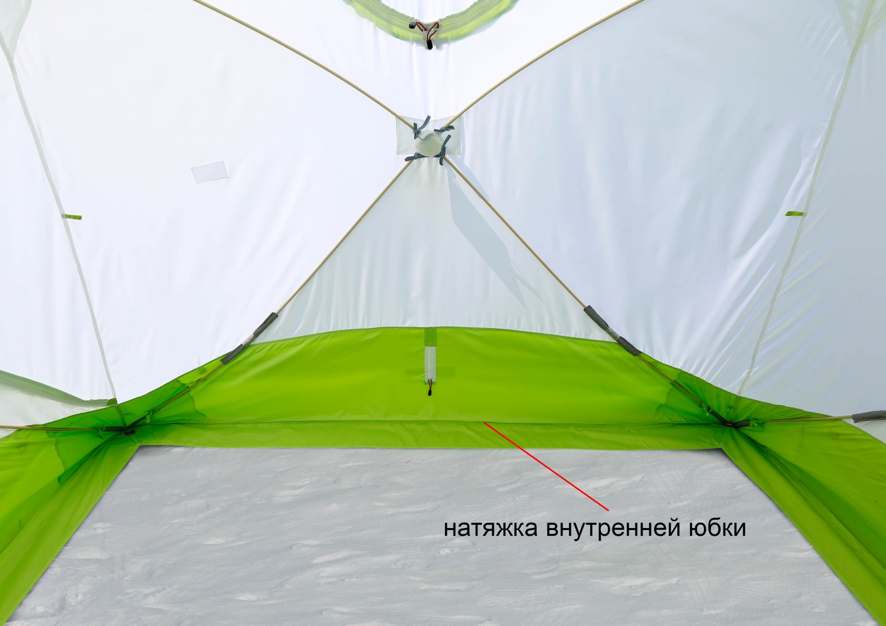При эксплуатации палатки без гидроизоляционного дна, крепление палатки ко льду (грунту) рекомендуется производить за усиленные петли, расположенные по углам палатки под внешней юбкой.
