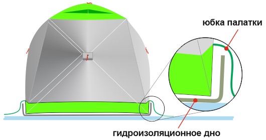Палатка с установленным гидро-термоизоляционным дном обладает уникальными защитными характеристиками как от промокания и подтопления укрытия снизу, так и от продувания нижнего периметра палатки ветром. При этом укрытие приобретает максимально эффективную теплоизоляцию в своей нижней части.