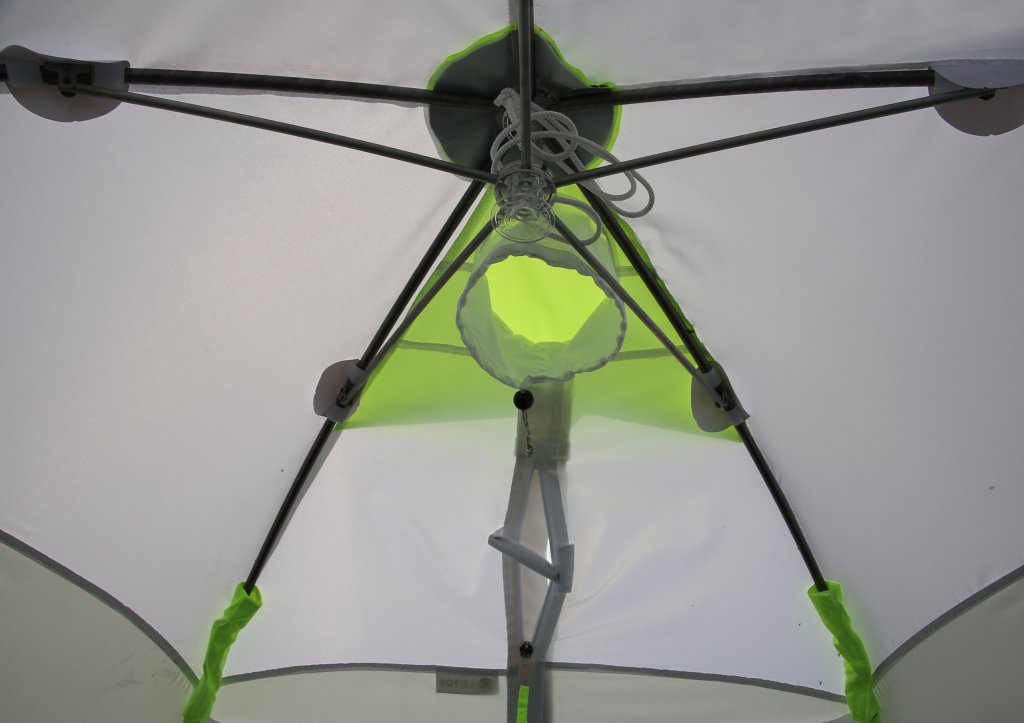 В конструкции каркаса палатки применен эксклюзивный запатентованный механизм зонтичного типа, который обеспечивает ее раскрытие практически в одно движение.