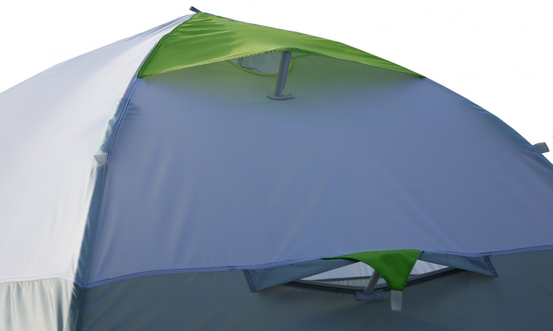 В нижней части палатки расположен приточный клапан для подсоса воздуха. С внешней стороны клапан защищен от попадания осадков открывающимся козырьком. Клапан регулируется высококачественной системой утяжки, позволяющей плотно обжимать установленную в него приточную трубу или производить полное закрытие, гарантируя защиту палатки от продувания.