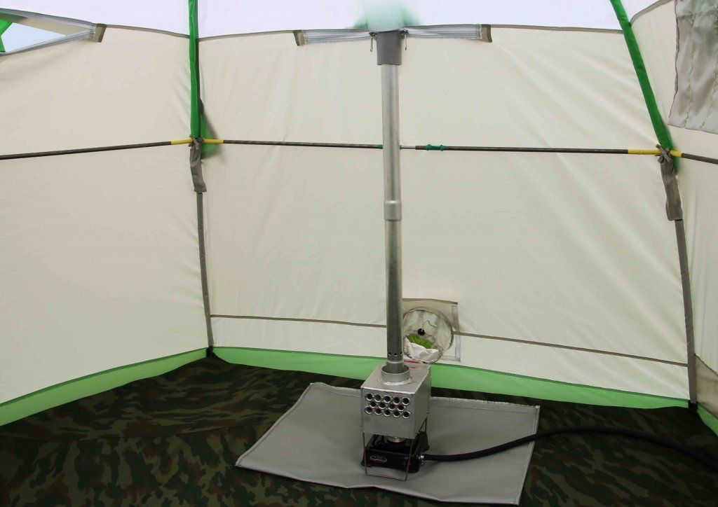 При использовании газового обогревателя с теплообменником вытяжная труба устанавливается в окошко, которое снабжено двойным замком на молнии, позволяющим фиксировать трубу теплообменника.
