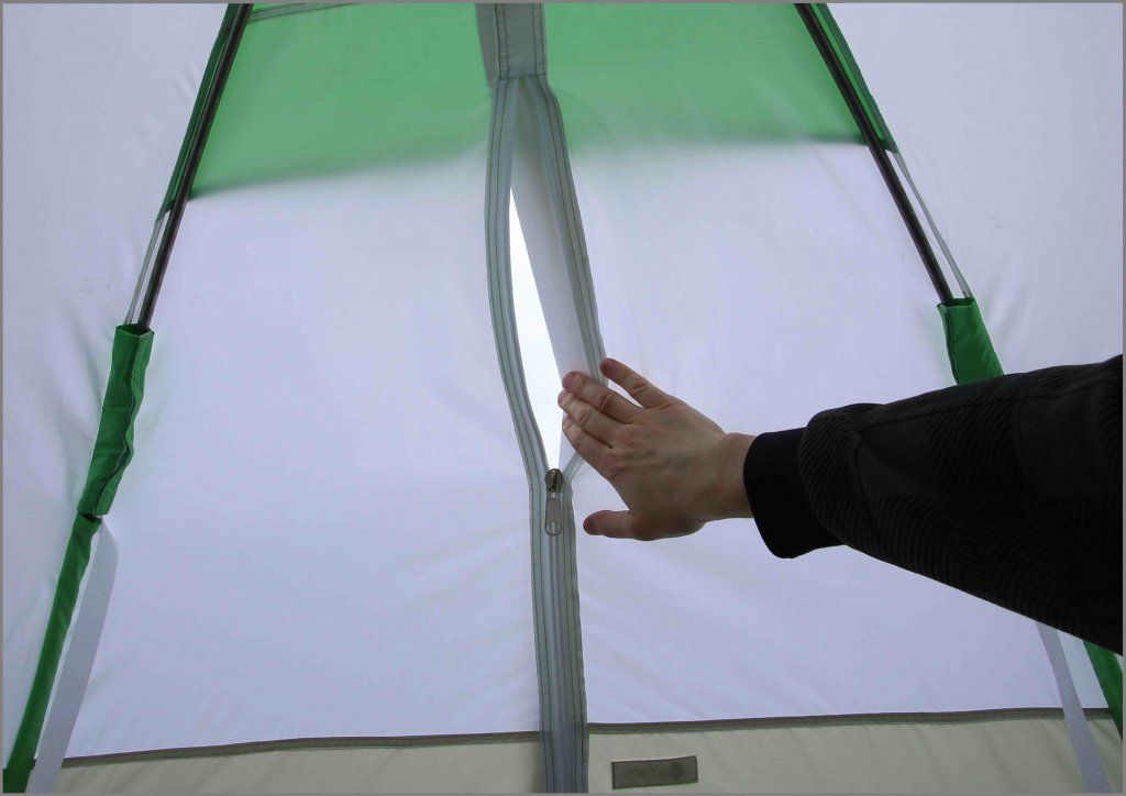 Широкая двухстворчатая Т-образная дверь палатки оснащена тремя замками, позволяющими открывать каждую створку по отдельности, а также раскрывать дверь во всю стенку палатки, образуя проход шириной 1,5 метра. Широкий вход позволяет заносить внутрь крупногабаритные вещи и является несомненным преимуществом палаток зонтичного типа. Молнии дверного замка с внешней стороны оснащены жесткой и широкой защитной планкой, обеспечивающей их надежную защиту от продувания ветром и обмораживания.