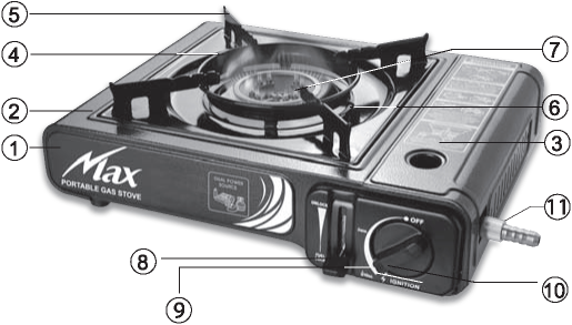 10. Использовать плиту, менять газовые картриджи или подключать/отключать газовые баллоны можно только в хорошо проветриваемом помещении, предпочтительно вдали от любых источников огня. Не курите во время работы с плитой