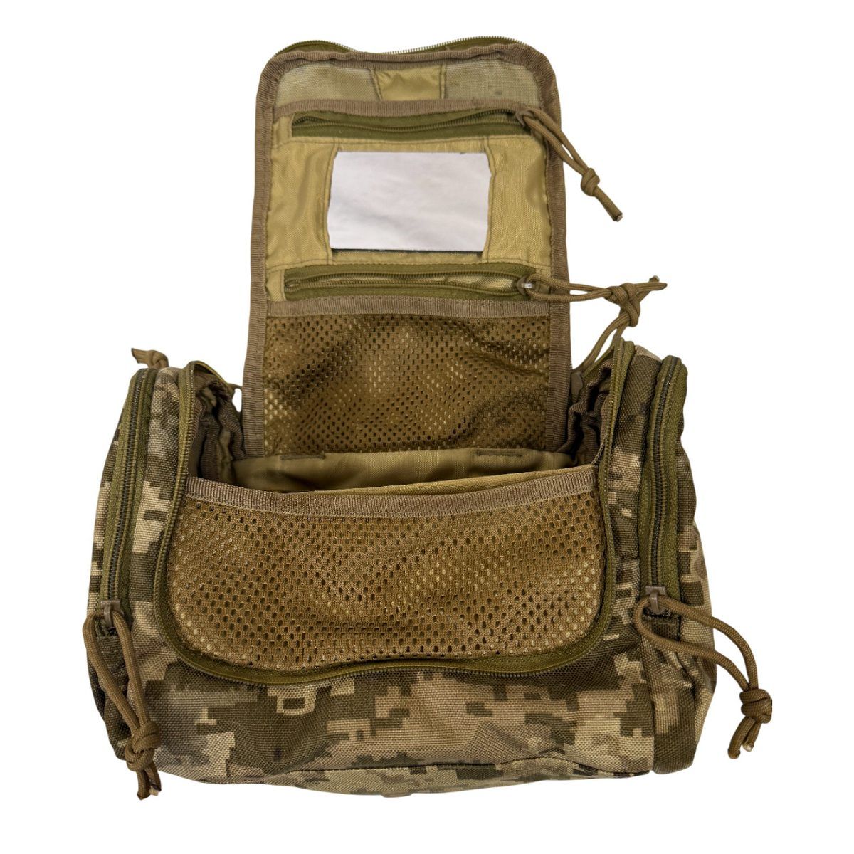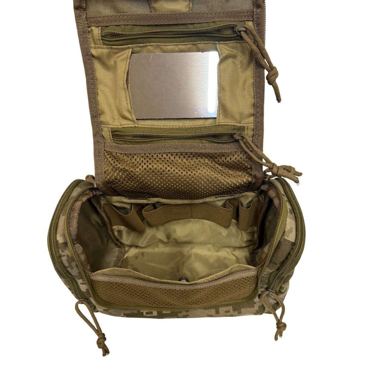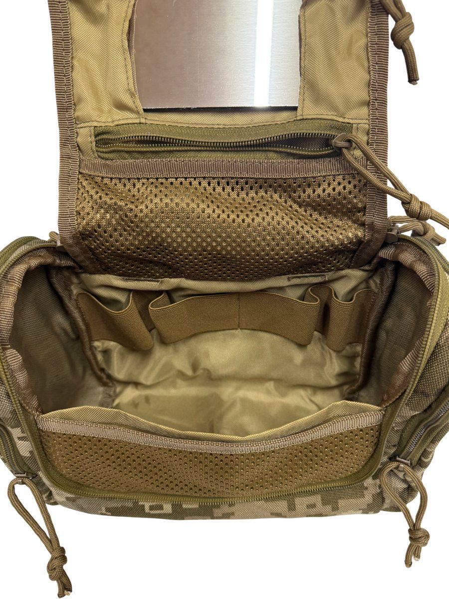 Предназначена для хранения предметов личной гигиены и минимального комплекта повседневной косметики солдата, пехотинца или разведчика. В общем, несессер позволит военнослужащему сэкономить время на утренние сборы во время военных учений или собраний. А небольшой размер сумочки не займет много места в тактическом рюкзаке или сумке.