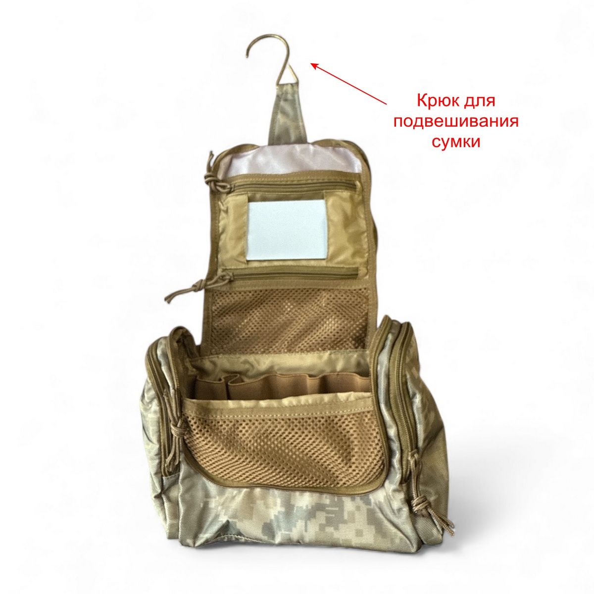 Сверху изделия пришита ручка для транспортировки гигиенической сумки в руках военного. В комплекте также идет специальный крючок, чтобы сумку можно было подвесить к поверхности в полевых условиях.