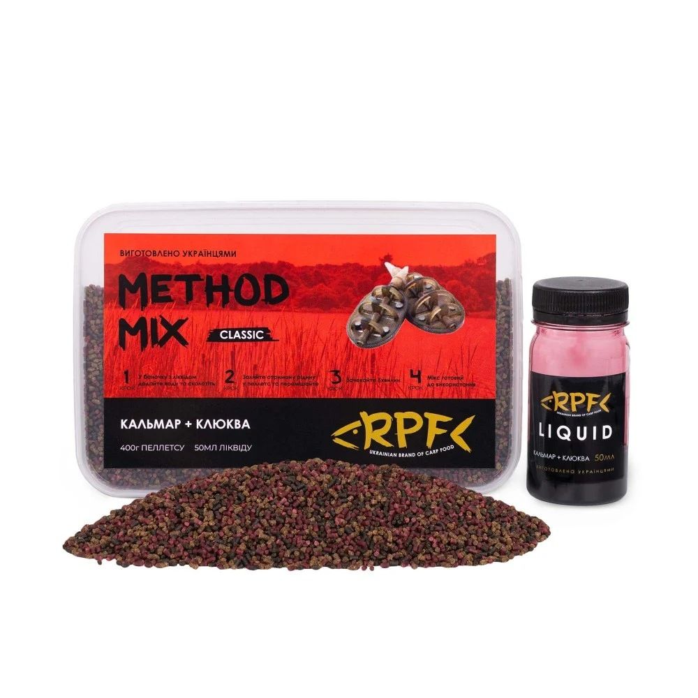 Прикормка RPF Метод-Микс 2в1 "Classic" - Кальмар+Клюква - 400 г пеллетса Ø2 мм + 50 мл ликвида