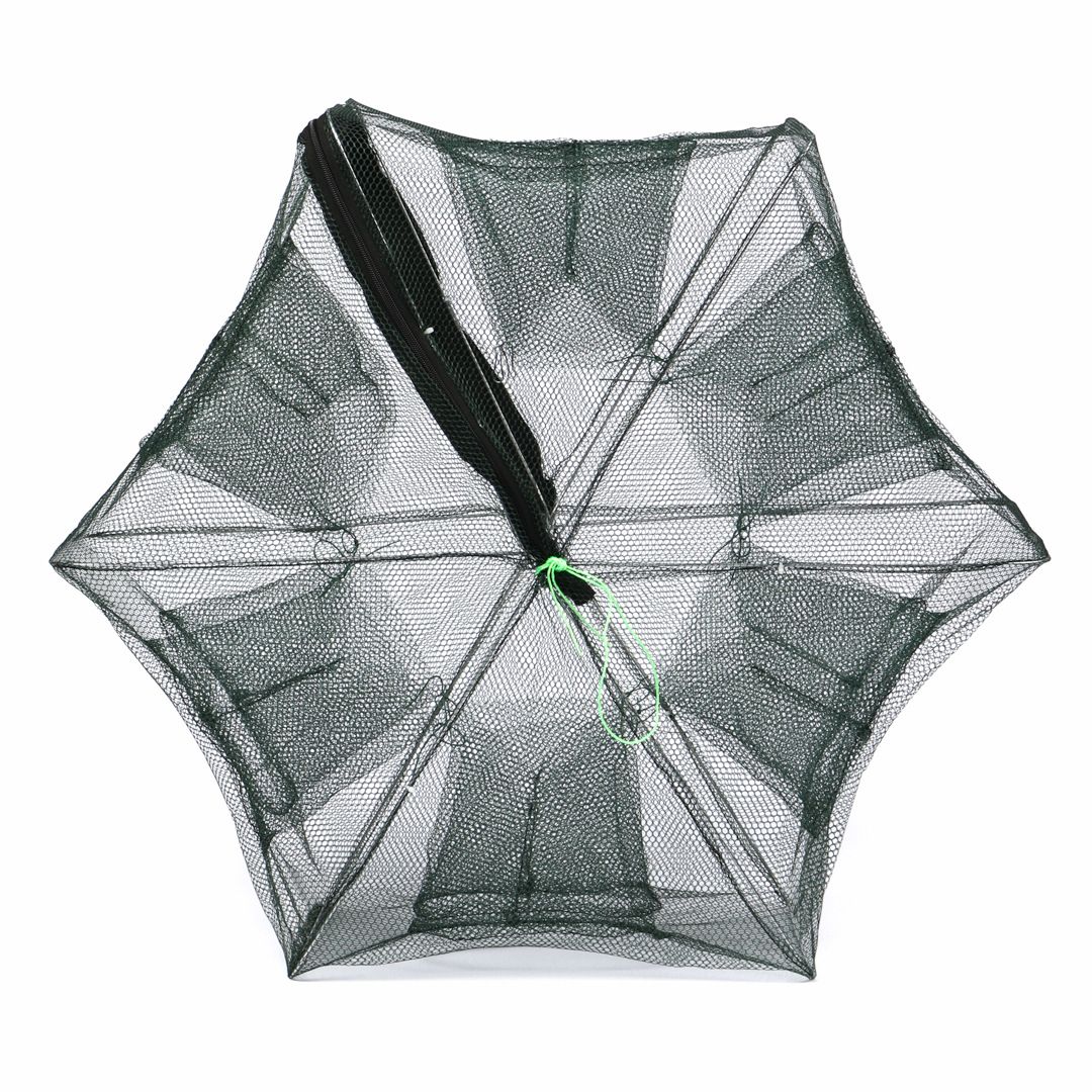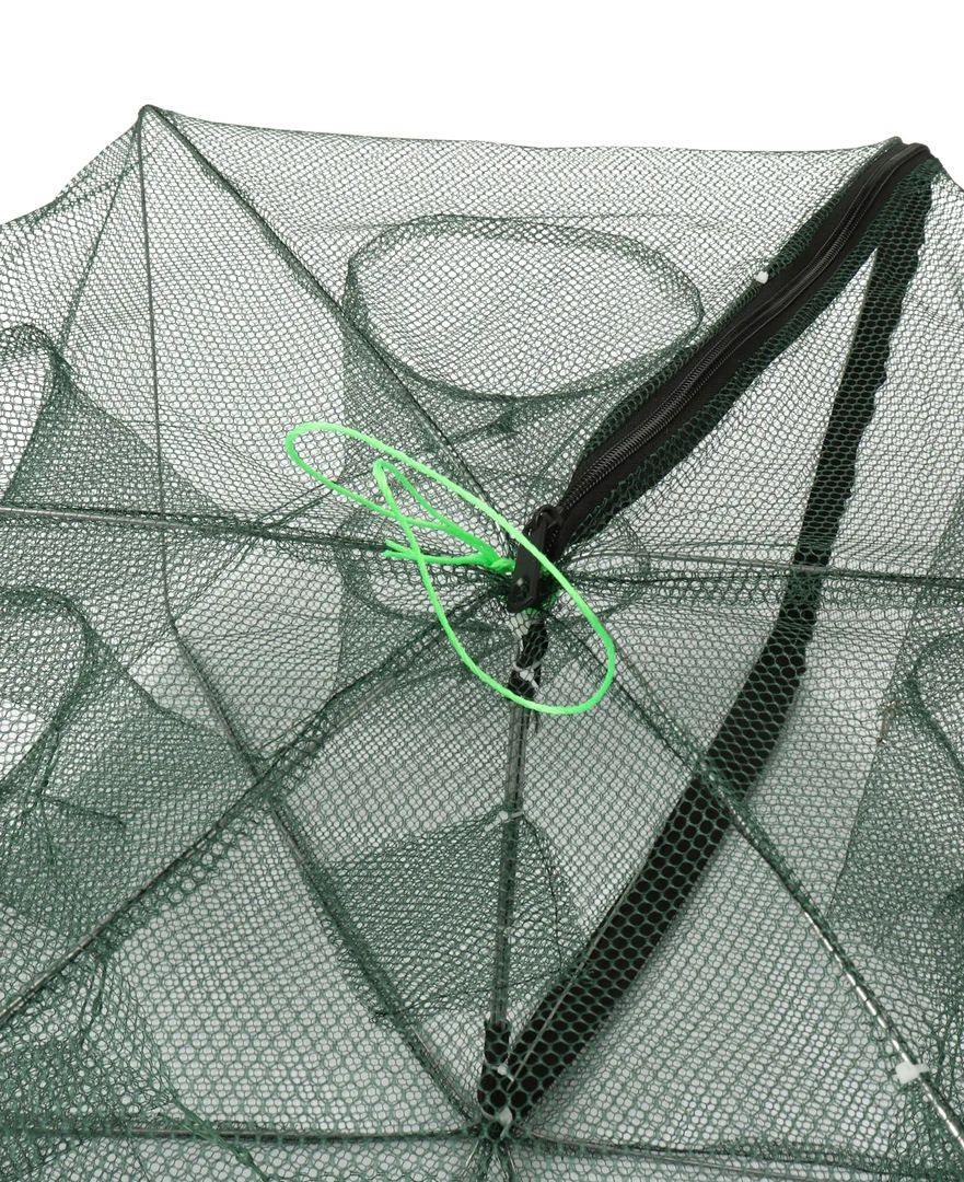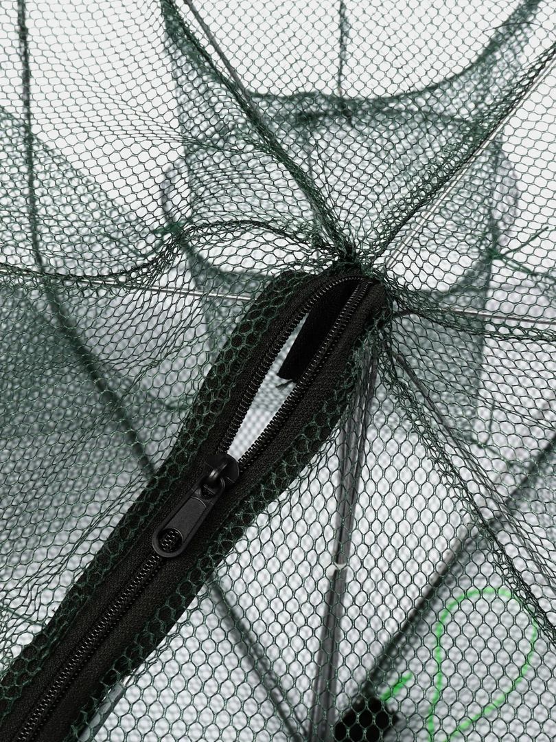 В открытом виде рачница выглядит как круглый шести-, восьмиугольник (в зависимости от модели). В одной из рамок предусмотрена небольшая застежка-молния. Застежка не только помогает быстро разложить, сложить снасть, но и дает полный доступ к внутренней части ловушки. В отличие от «зонтов», Вы можете свободно закладывать приманку и извлекать улов (что особенно важно, когда раки цепляются за сетку клешнями).