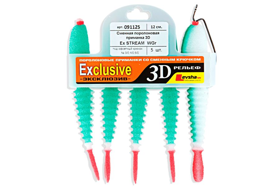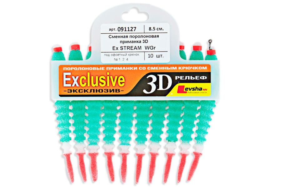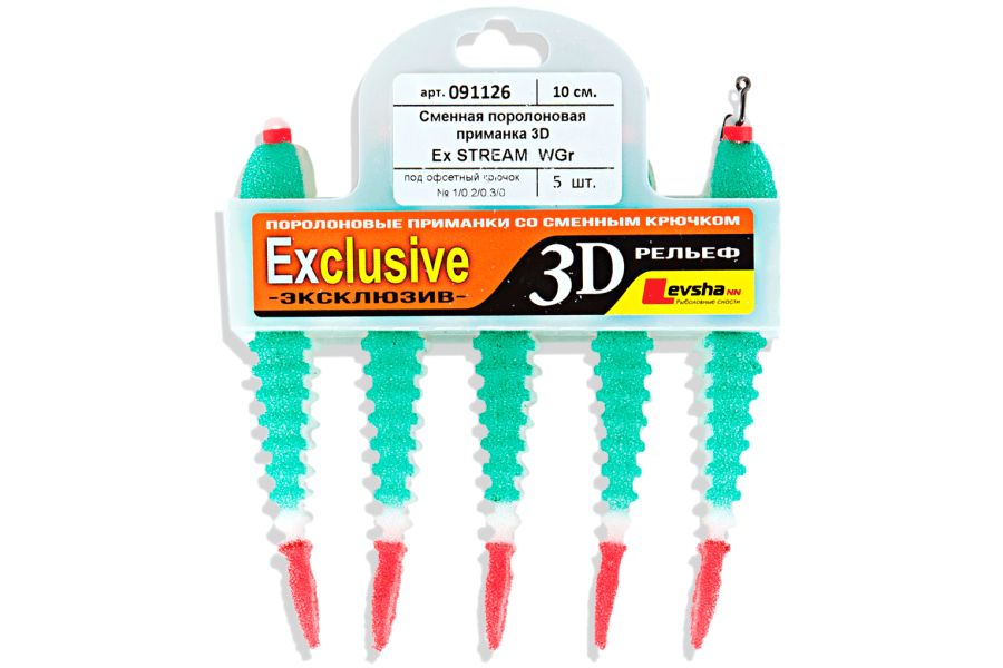 Поролоновые рыбки 3D Ex Stream имитируют молодь большинства рыб. Форма рыбок 3D Ex Stream была разработана специально для ловли на течении. В этой серии был впервые использован волнообразный рельеф поверхности рыбки и это новшество принесло удивительные результаты. Волнообразный рельеф многократно повышает привлекательность поролоновой рыбки для хищника и делает движения приманки более реалистичными.