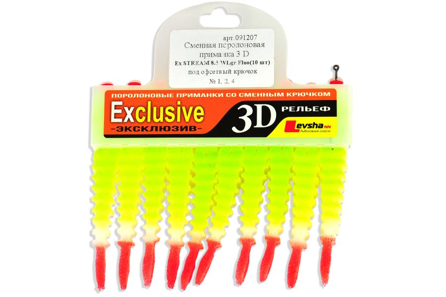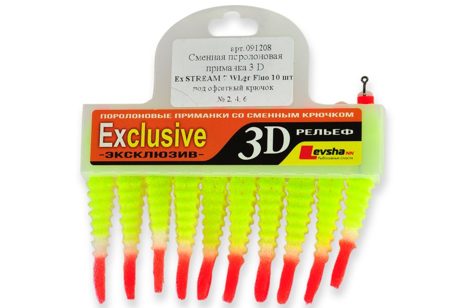 Поролоновые рыбки 3D Ex Stream имитируют молодь большинства рыб. Форма рыбок 3D Ex Stream была разработана специально для ловли на течении. В этой серии был впервые использован волнообразный рельеф поверхности рыбки и это новшество принесло удивительные результаты. Волнообразный рельеф многократно повышает привлекательность поролоновой рыбки для хищника и делает движения приманки более реалистичными.