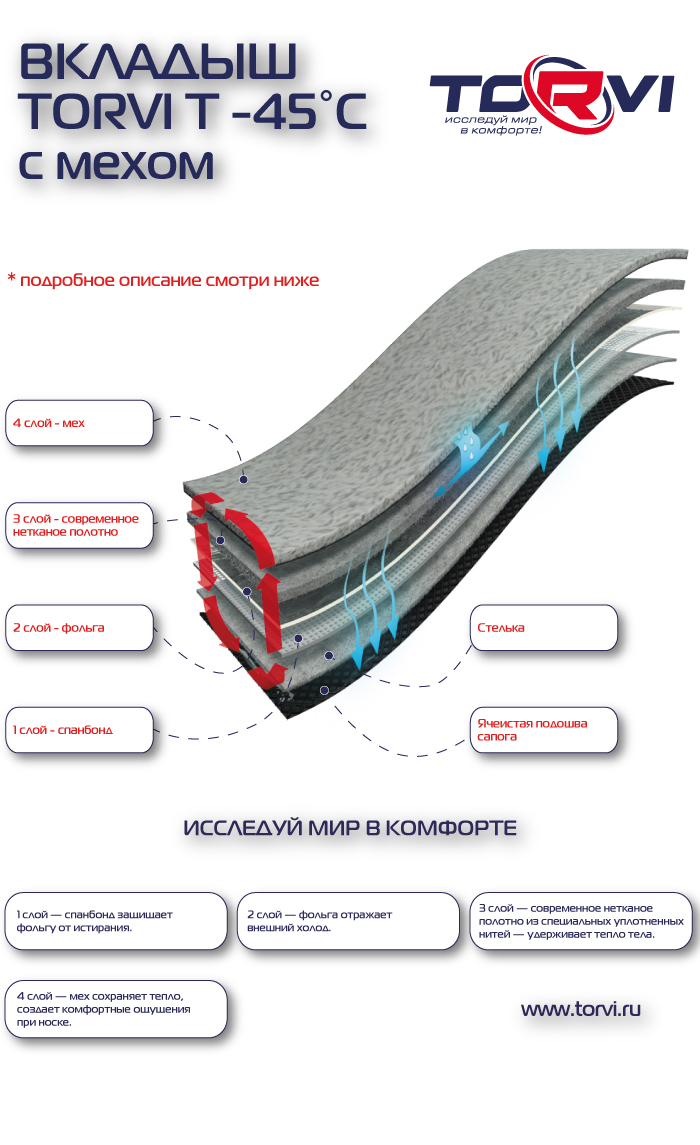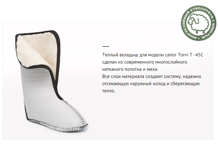 Теплый вкладыш для модели сапог Torvi T -45C сделан из современного многослойного нетканого полотна и меха.