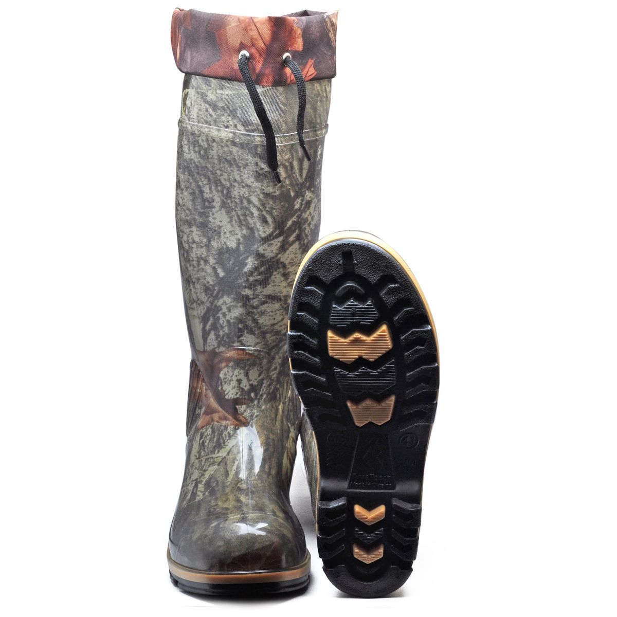 В верхней части голенища сапога находится манжета со шнуровкой, обеспечивающая плотное прилегание к ноге и препятствующая попаданию холодного воздуха, снега и дождя. Подошва с перфорированной структурой обеспечивает хорошее сцепление со скользкой поверхностью. Камуфляжная окраска отлично гармонирует с одеждой стиля милитари и рыболовными костюмами.