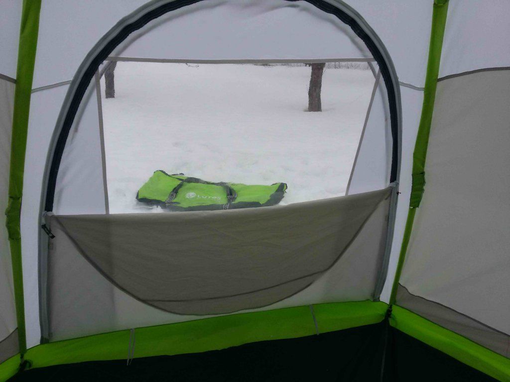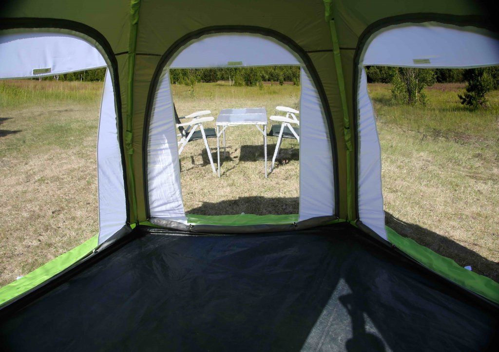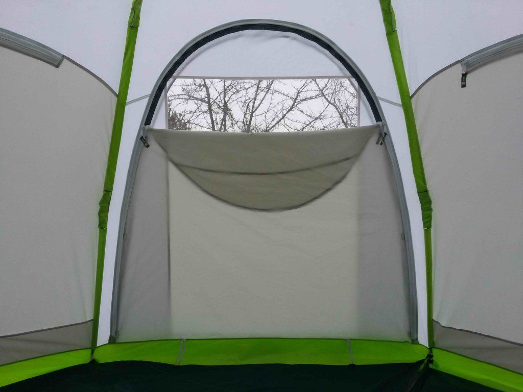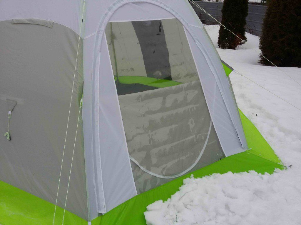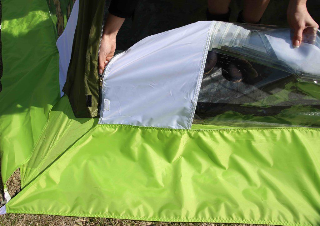 Стенка крепится к D-образному входу с внешней стороны палатки и при этом не препятствует работе основной стенки этого входа. Основную стенку D-образного входа палатки можно закрывать/открывать полностью или приоткрывать, частично регулируя высоту оконного проема.