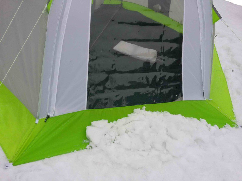 Нижняя часть прозрачной стенки снабжена защитной юбкой с креплениями для ввертышей (колышков). Юбка стенки полностью дублирует юбку палатки. Наличие защитной юбки на стенке, позволяет присыпать ее снегом или землей, тем самым защищая палатку от ветра и влаги.